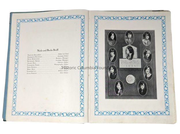 Black and silver "Nods and Becks" yearbook for Chicora College for the 1926 school year. The cover states the title of yearbook and associated school year, as well as includes a silver seal of the school and a depiction of the Hampton-Preston House.Context