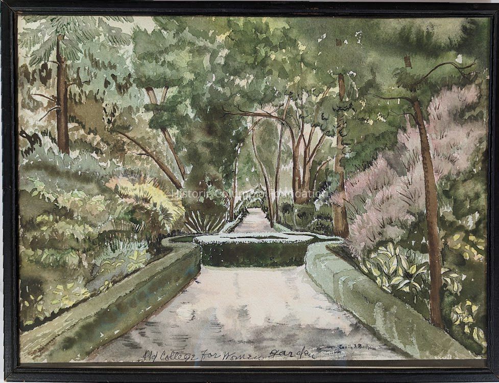 Labeled "Old College for Women Garden," this watercolor was painted by local artist Cecile Adams Berly (1899–1983) from an early twentieth-century postcard of the gardens (see HC.2013.3.3).Made/Created