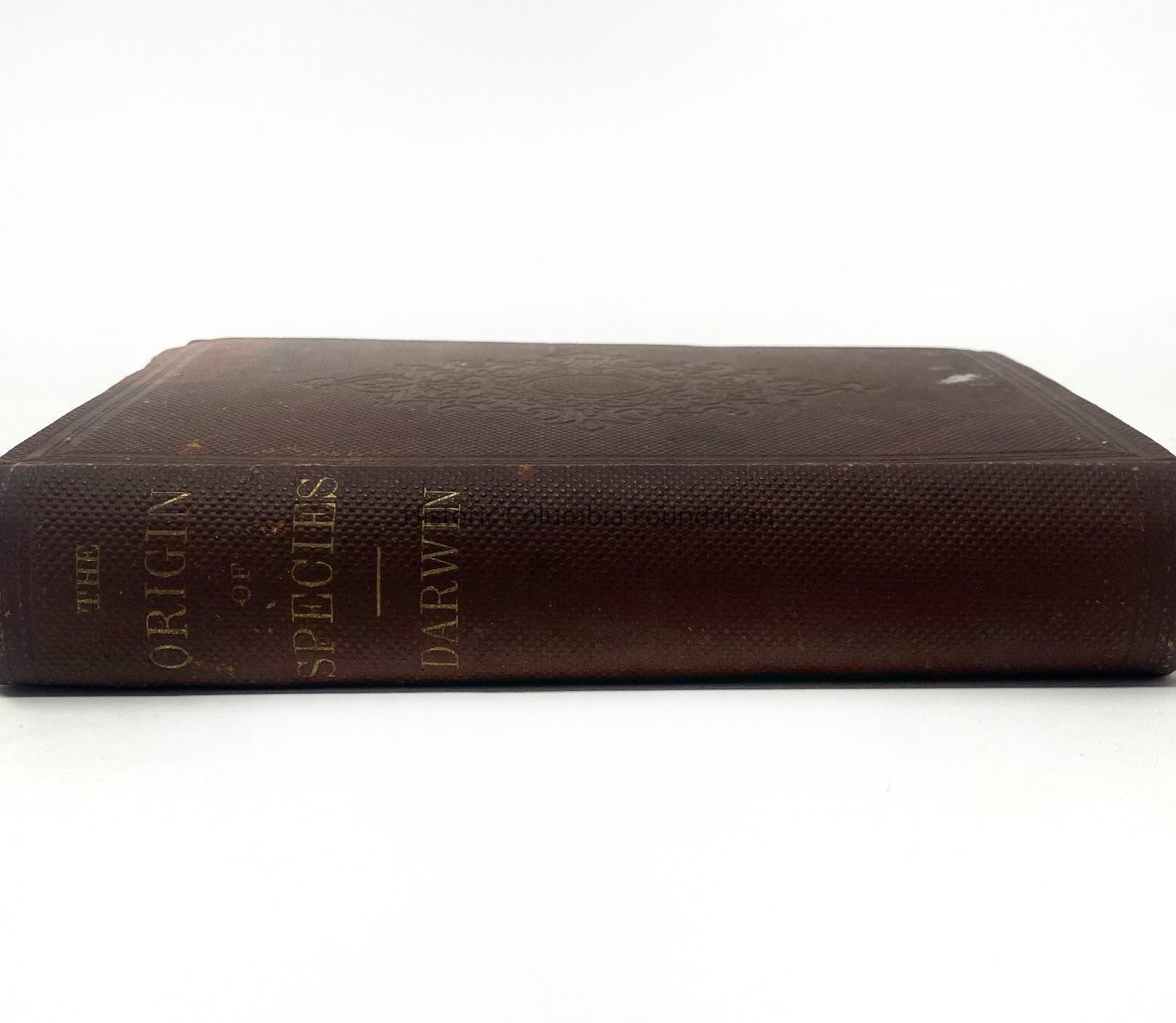 Book with red-brown embossed cover. The front contains an embossed scroll-design, and the title "The Origin of Species" appears on the spine in gold along with the author's name. An inscription on a front page is recorded in pencil: "C. F. Hampton 'Linden' March 1860".Context