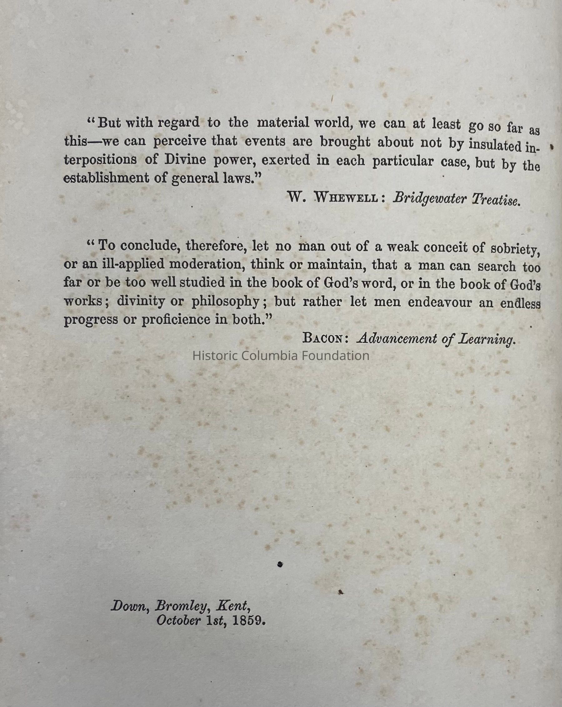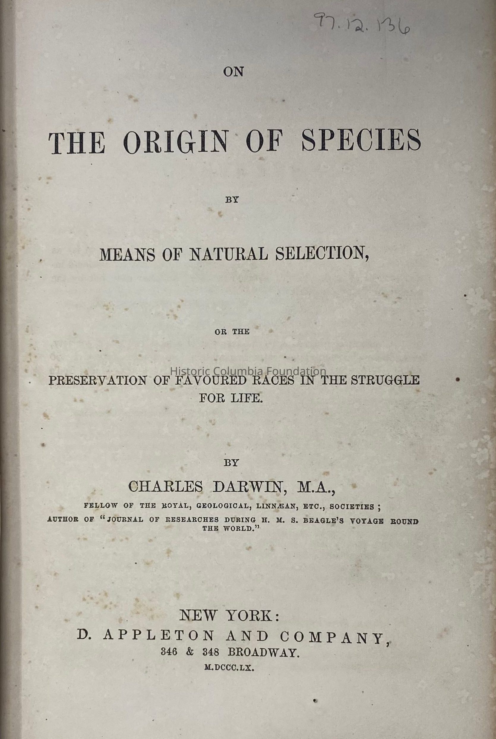 With the publication of Charles Darwin's "Origin of Species" in 1859, debates intensified over the relationship between science and religion. The author, Charles Darwin (1809–1882), a naturalist most well known for his exploration of the phrase "survival of the fittest," wrote the book to attract to a widespread audience to support naturalism and evolution. While Darwin began writing the book in the late 1830s, the first edition was not published until November of 1859. There were only 1,250 copies printed that year, of which 1,170 were available for sale. This particular copy was published in New York by D. Appleton and Co. in 1860.