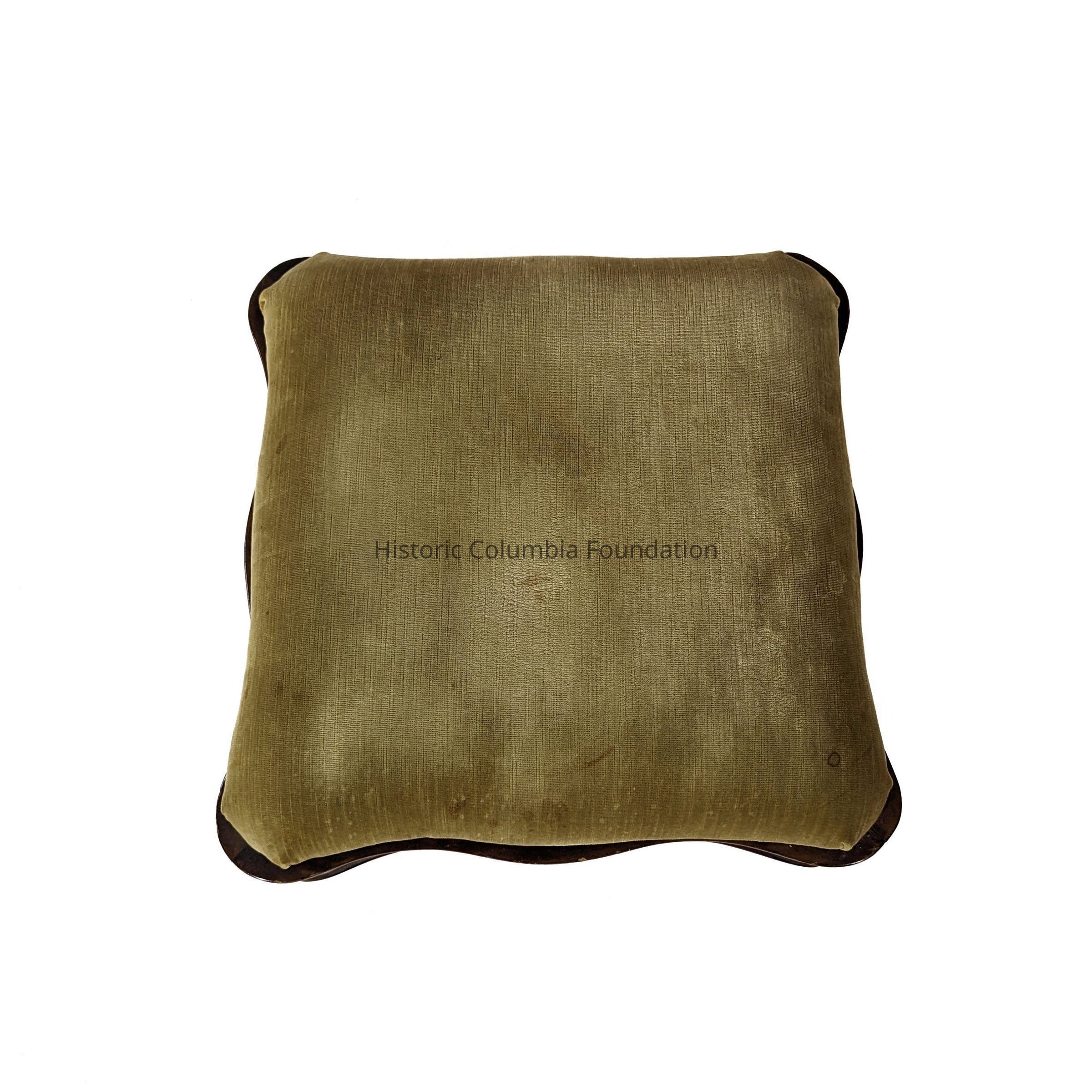 Green velvet ottoman. Completed in the Rococo Revival style, this footrest features a cushion covered in olive green upholstery, a rosewood base, and casters on the feet.Furniture Details