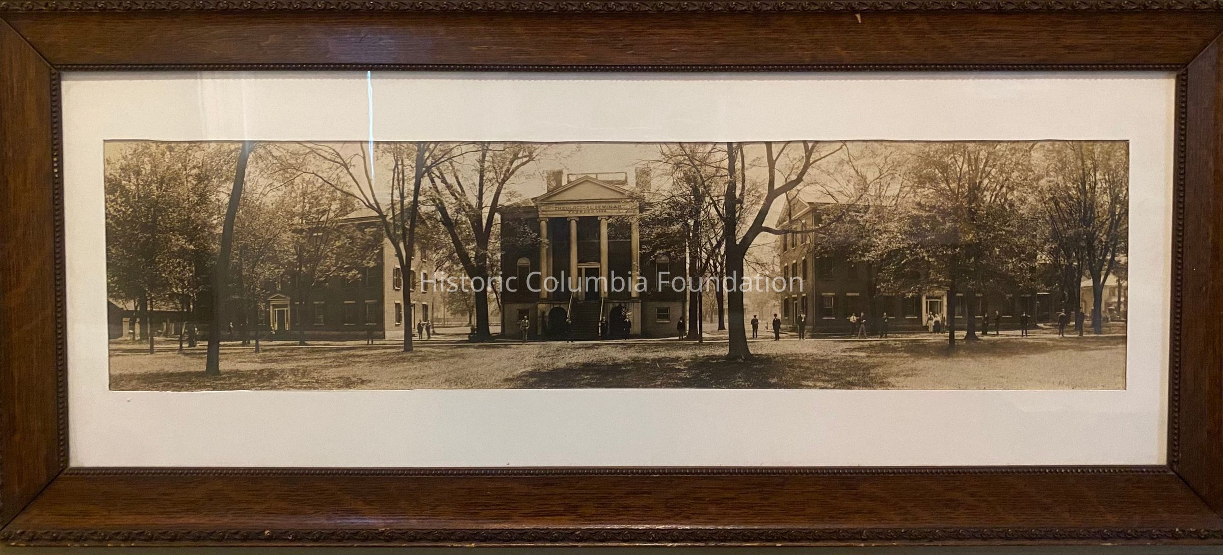 Panoramic sepia-style photograph of three large buildings within a wooden frame. The foreground contains trees, some of which are nearly bare of all leaves. There are people scattered near and around the buildings. The centermost building has a center set of stairs and four white ionic columns supporting a white plain pediment and frieze. The large lettering on the frieze reads: "Theological Seminary, Founded 1830." A portion of a smaller fourth building can be seen on the far left of the image.Photograph Details