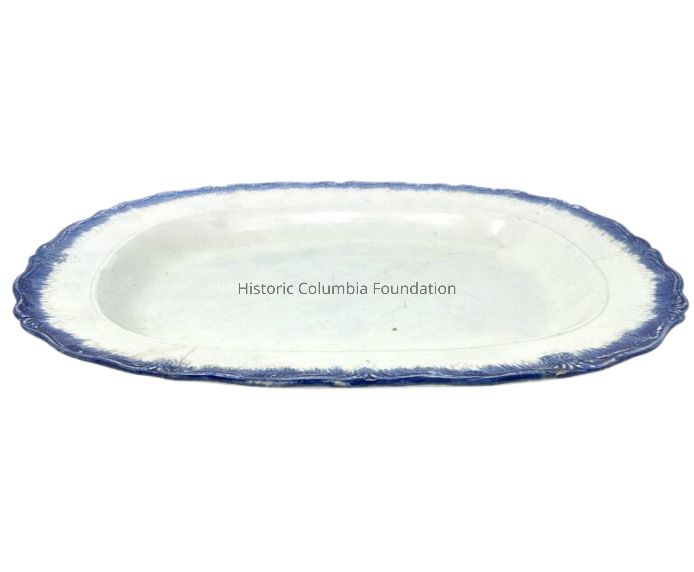 Blue shell-edge pearlware oval platter with blue slip. The piece is press molded and the back is impressed with the maker's mark. The backside shows stilt marks in three places: each mark has three holes in a triangular pattern.Context