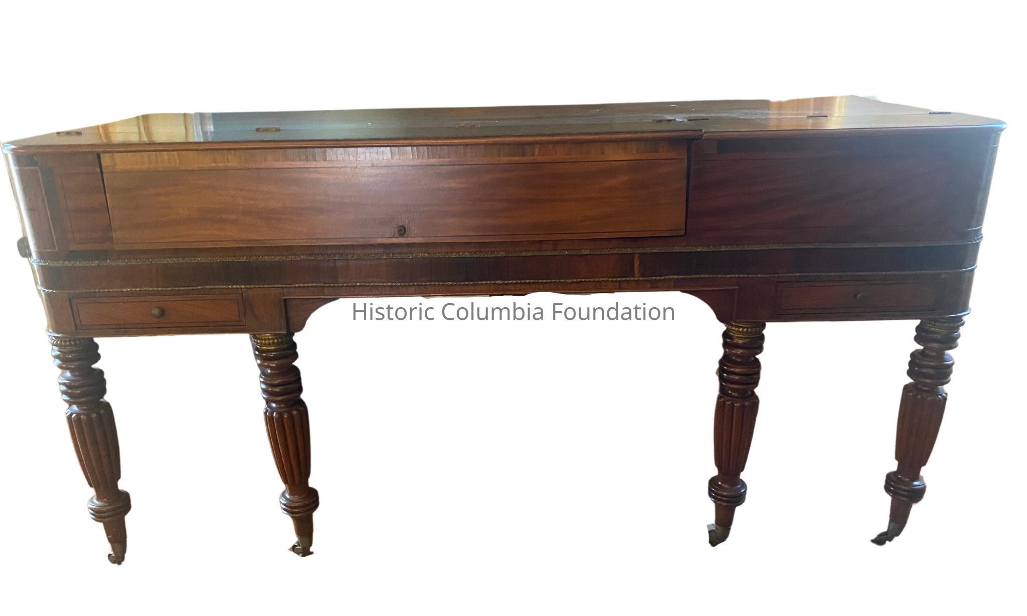 Pianoforte in a square mahogany case with rounded corners. The case is decorated with crossbands of rosewood with lines of brass and rosewood. It contains a keyboard with a lifting cover and two drawers. It has a hinged storage compartment. The case rests on ring turned and reeded tapered legs. The hardware is made of brass, including the casters. An inside panel contains the inscription, "Pratt Place, Camdentown London, John Siegling C.H.S., Charleston, S.C." while a label above the keyboard faintly reads, “Gunther and Horwood, Manufacturers, Pratt Place, Camden Town, London, John Siegling, Charleston, S.C."Context