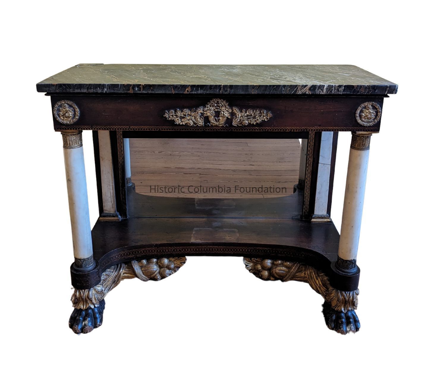 Pier table are similar to modern day console tables. Commonly found against a wall in a parlor between two windows, doors, or columns, pier tables were found in Europe as early as the 16th-century before becoming popular in North America in the second half of the 19th-century. While a pier mirror was commonly hung above the tables, the mirror under the table top would not only hide the wall and therefore making the room appear larger, but it would also help to redirect natural light or the light created by the lighting equipment that could be placed on top of the table. Pier tables could also be used to display rare trinkets, trophies, and other goods, showcasing wealth and accomplishments to create conversation.