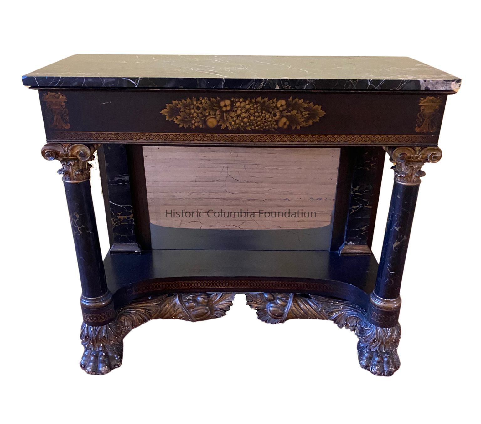 Pier tables are similar to modern day console tables. Commonly found against parlor walls between two windows, doors, or columns, pier tables were found in Europe as early as the 16th century before becoming popular in North America in the second half of the 19th century. While a pier mirror was commonly hung above the tables, the mirror under the tabletop would not only hide the wall—therefore making the room appear larger—but it would also help redirect light into the room. Pier tables could also be used to display rare trinkets, trophies, and other goods, showcasing wealth and sparking conversation.
