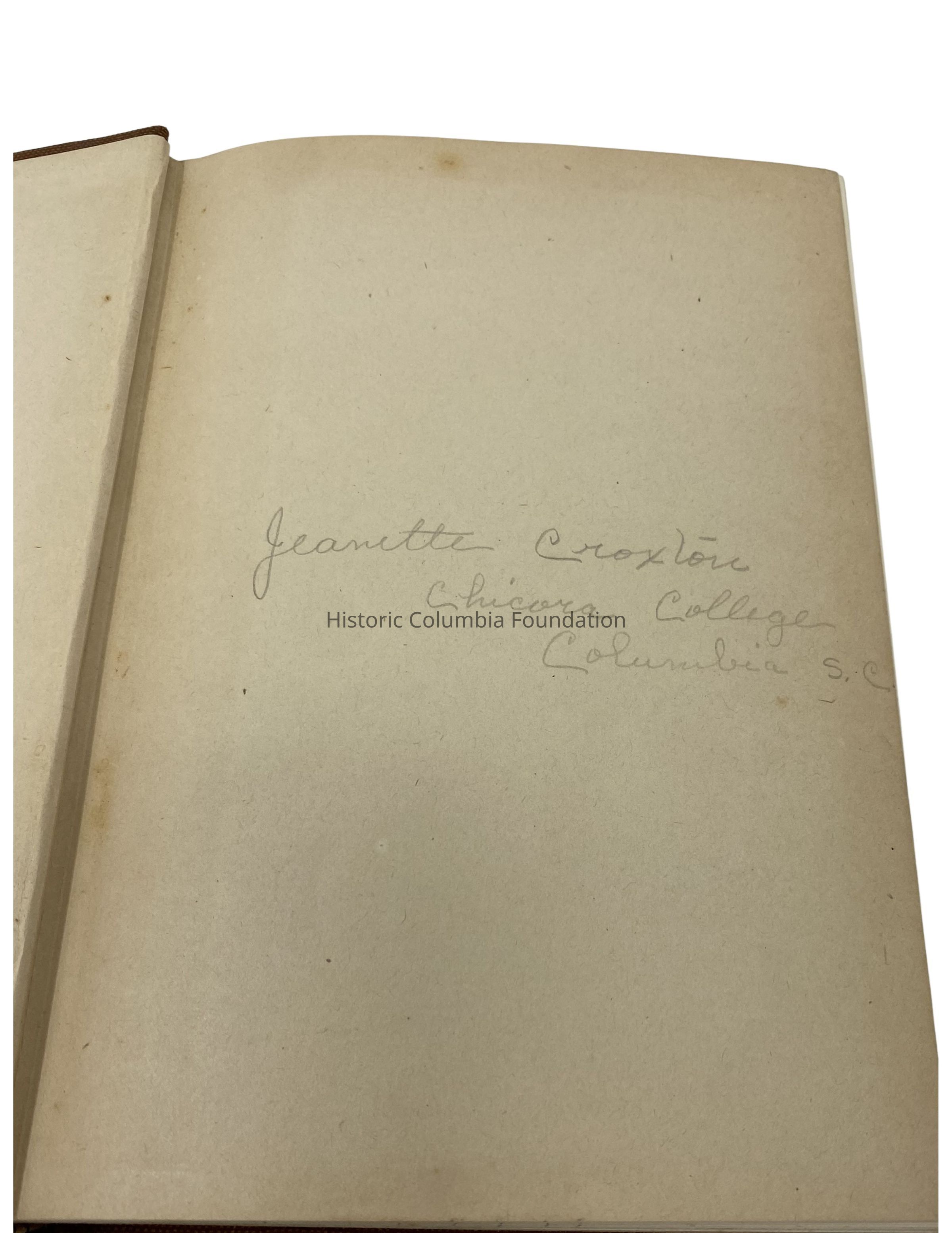 Among them was Jeanette Croxton (1900–1996) who used this book while attending Chicora College at the Hampton-Preston Mansion around 1919. In 1932, she married John Willis Massey (1891–1936), and together the couple had one daughter, Joan (b. 1933), before John’s untimely death. Jeanette lived most of her life in Kershaw County and worked as a seamstress at Superior Cleaners and a salesclerk at Belk Department Store. In 1996, Jeanette was buried in the cemetery behind Beaver Creek Presbyterian Church where she had been a lifelong member.Inscription/Signature/Marks