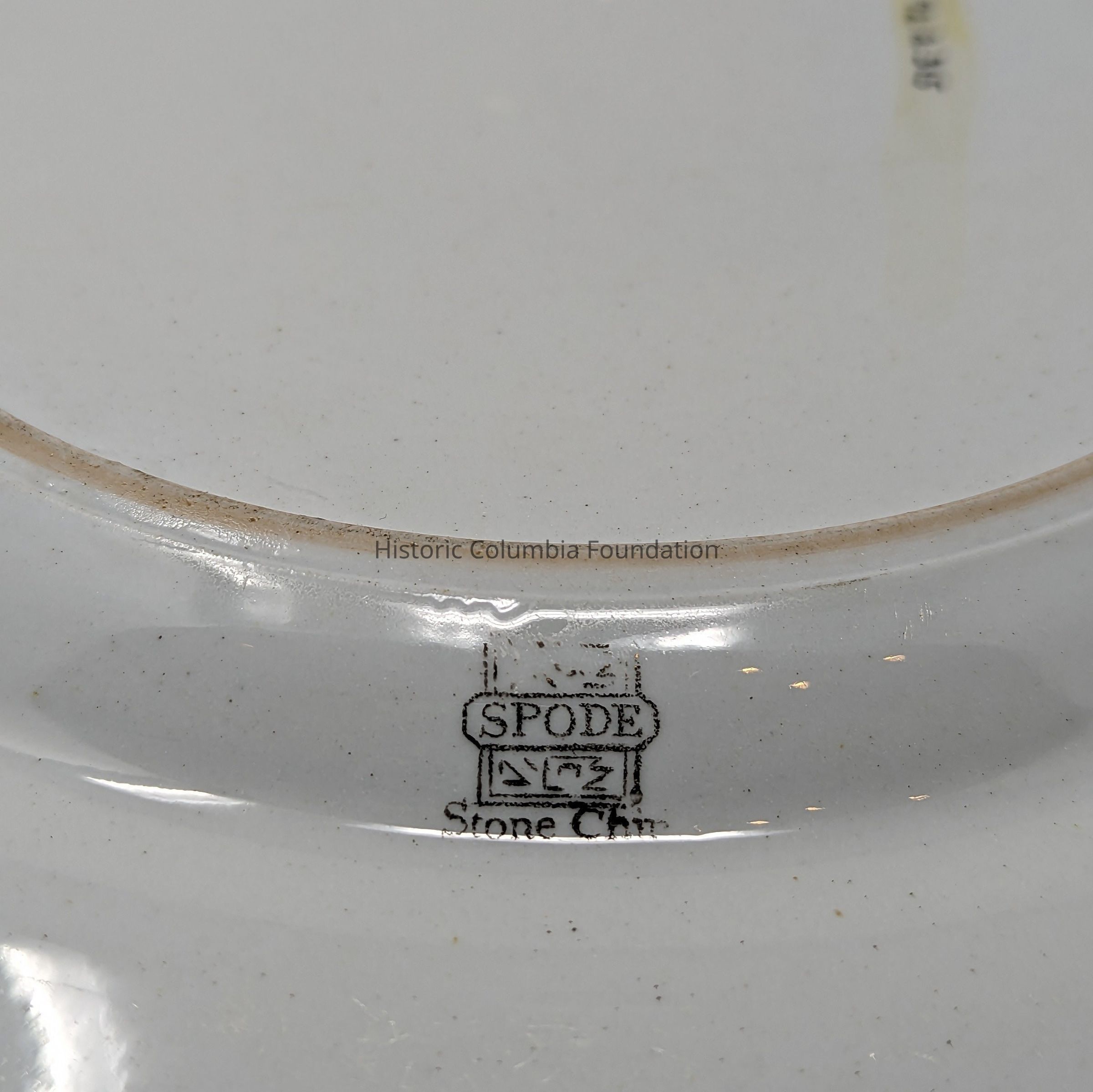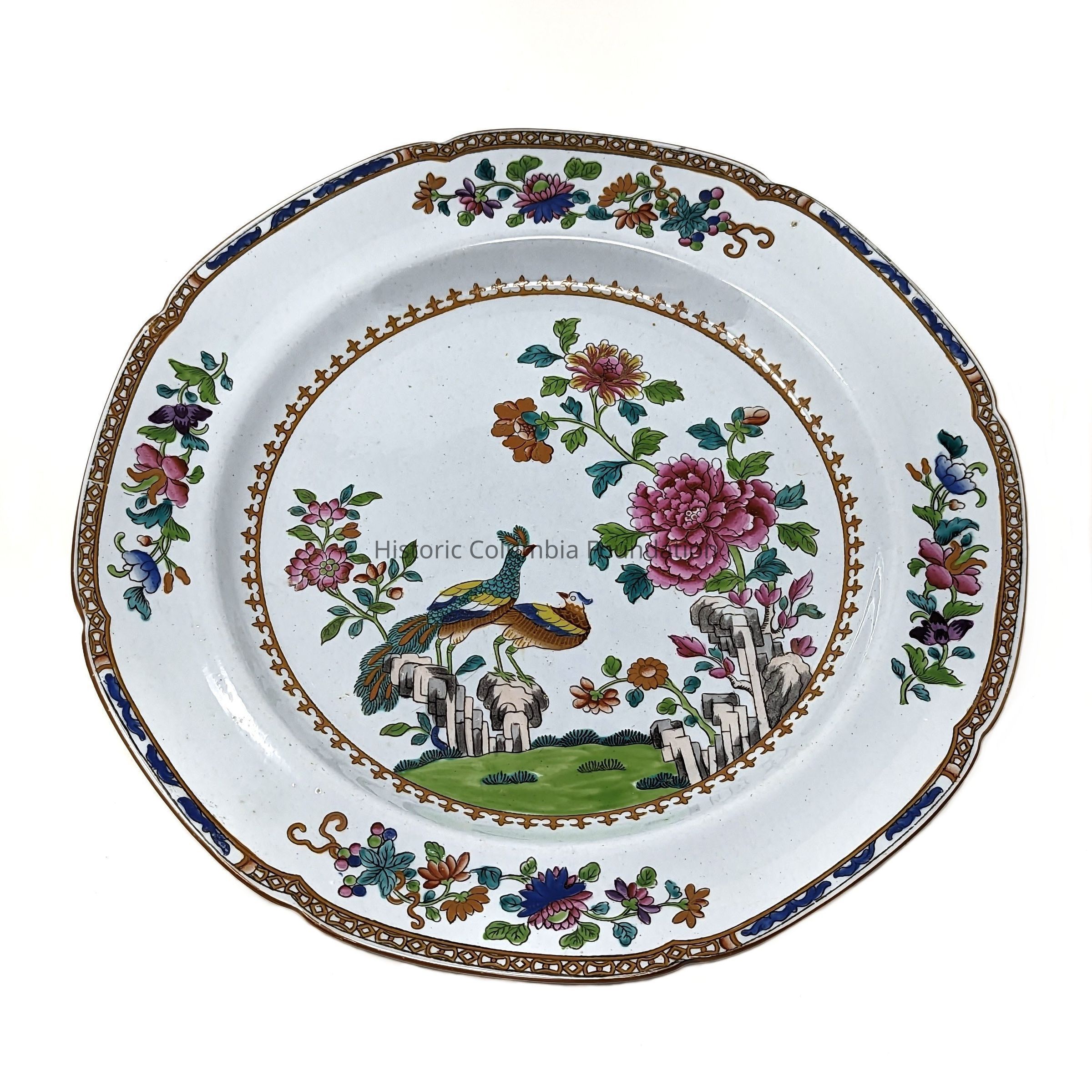 Stone plate china with underglaze colors. It has a floral pattern on border, and pheasants and flowers in center. The underside contains the Spode maker's mark.Context