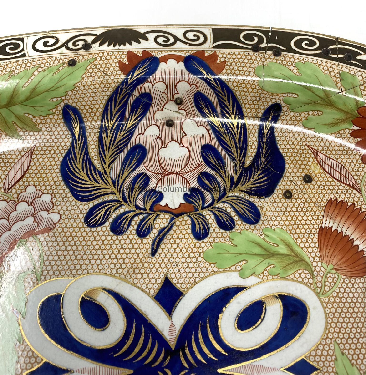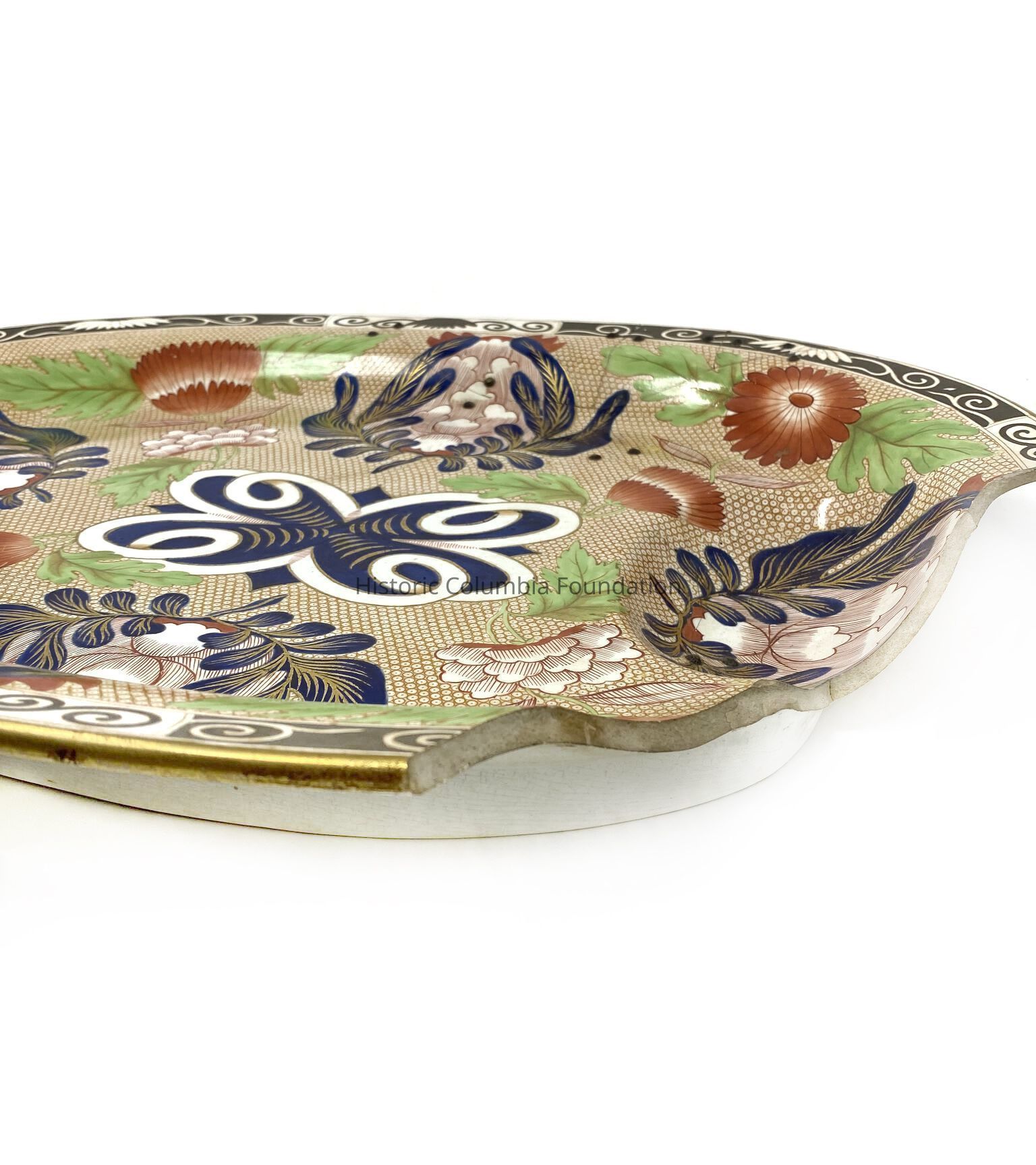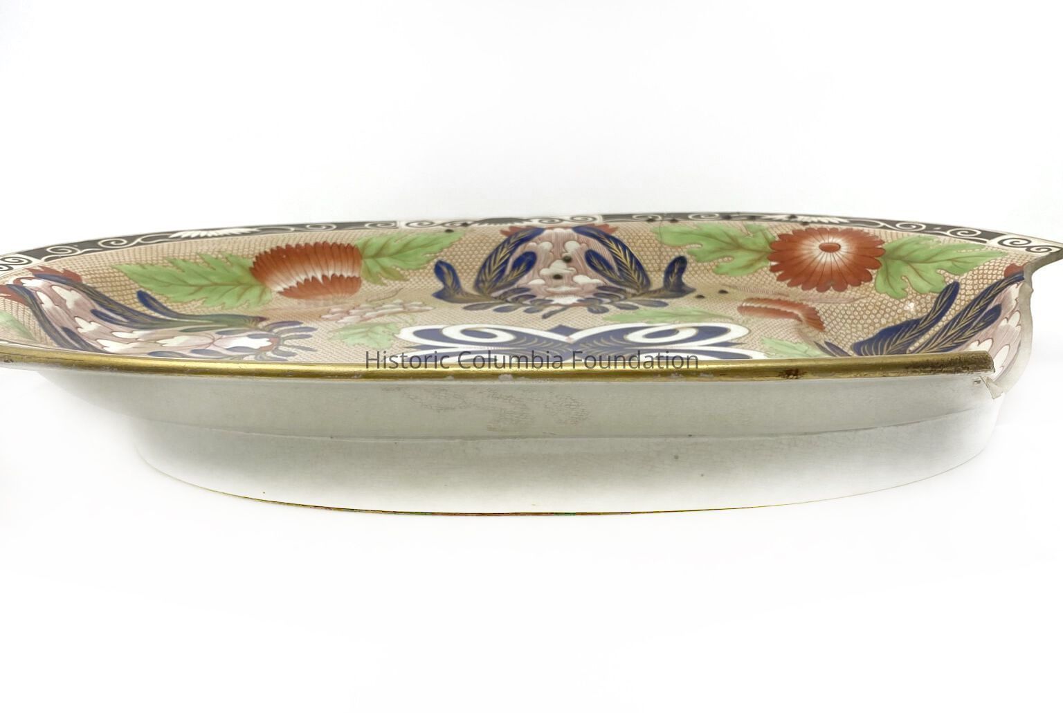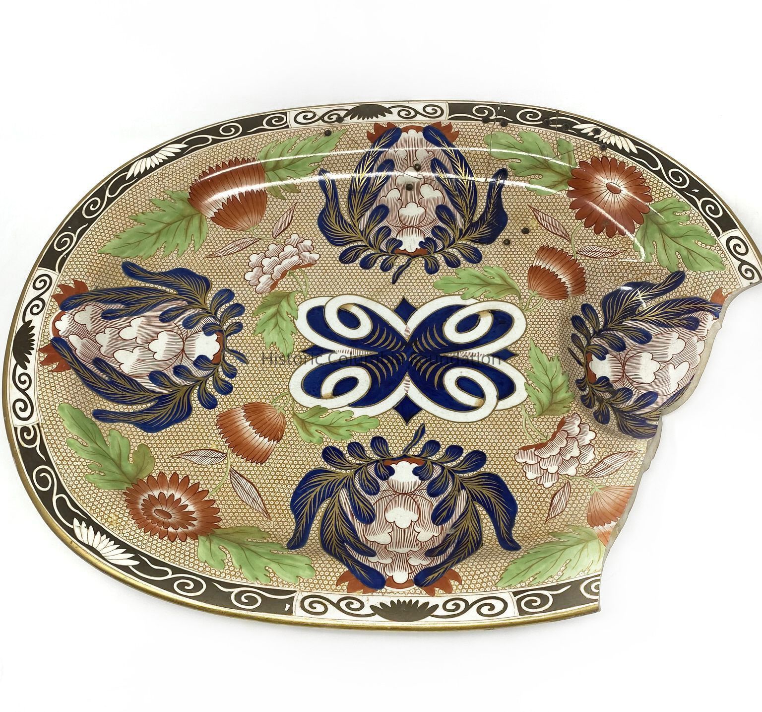 Large oval platter with "Chrysanthemum" pattern: polychrome floral design. The platter is predominately brown and black with embellishments of white, green, and orange. One end of the platter has a deep, sunken reserve. There are significant previous repairs done to the platter, as well as loss of about 1/6th of the platter.Context