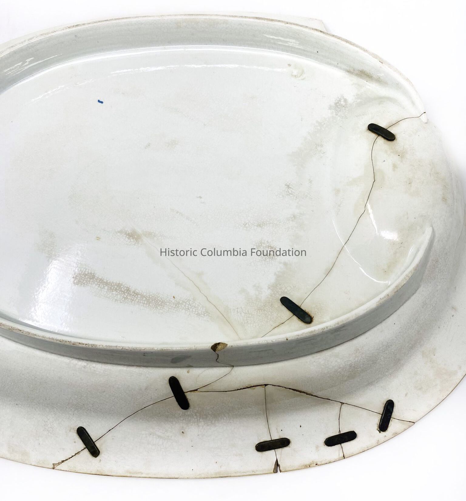There are several questions regarding this platter: how was it so damaged; why was it repaired in this manner with metal; and what became of the missing piece? Several of the repairs are over the dip in the bowl which would have collected some of the juices from the meat that would have been cooked and presented on the platter. Research is ongoing to uncover more information about this platter.Made/Created