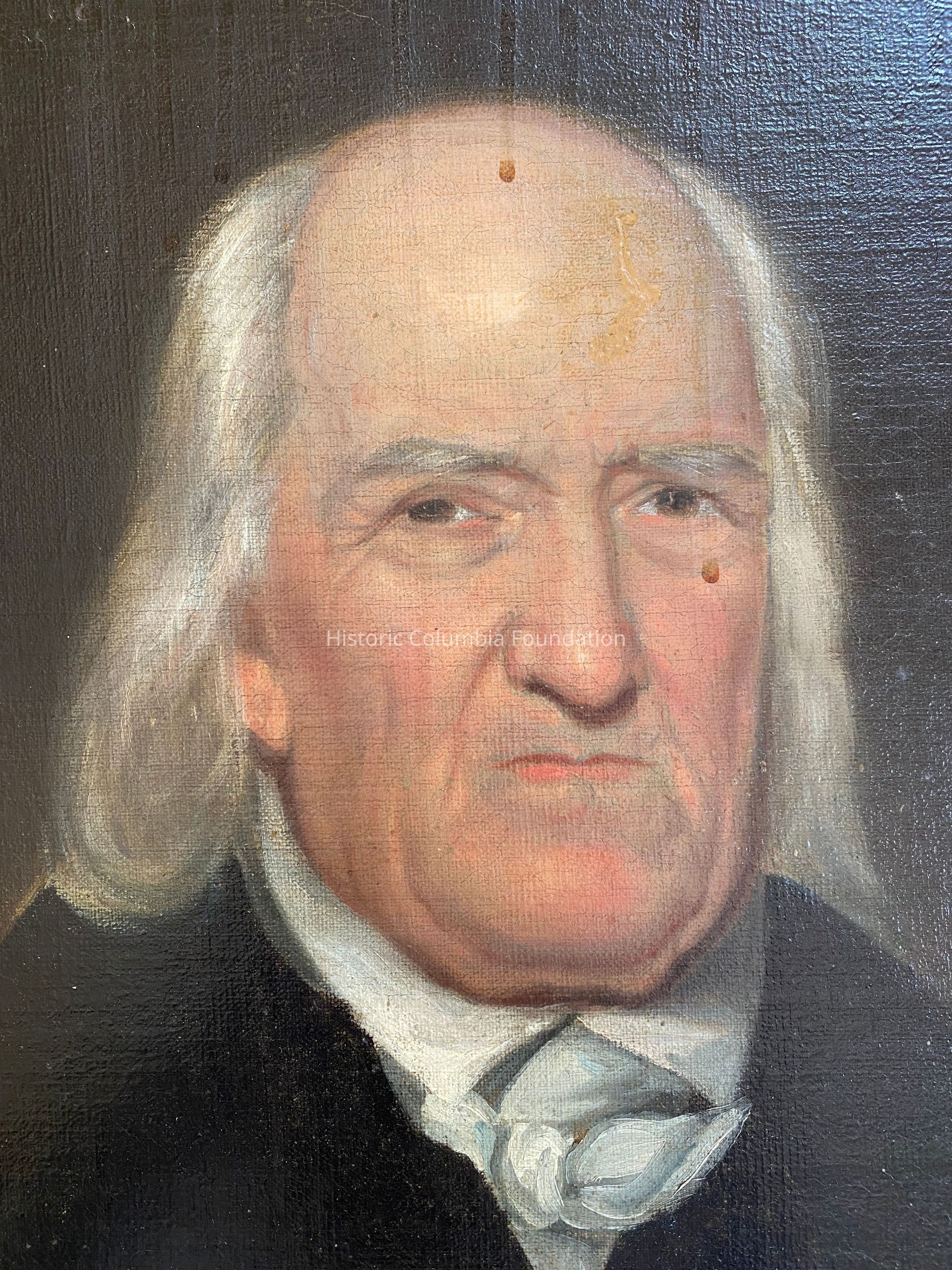 Oil on canvas painting of an elderly white man in a half-length portrait. Depicted against a dark backdrop, the figure has brown eyes and stares outward at the viewer. He is balding on the top of his head and has long white hair along the sides. A white cravat is secured around his neck and is tucked against his collared white shirt and black suitcoat. Dripping varnish and previous attempts to conserve the painting disfigure portions of the man's face and surroundings. The painting is secured in a wooden frame.Type of Painting