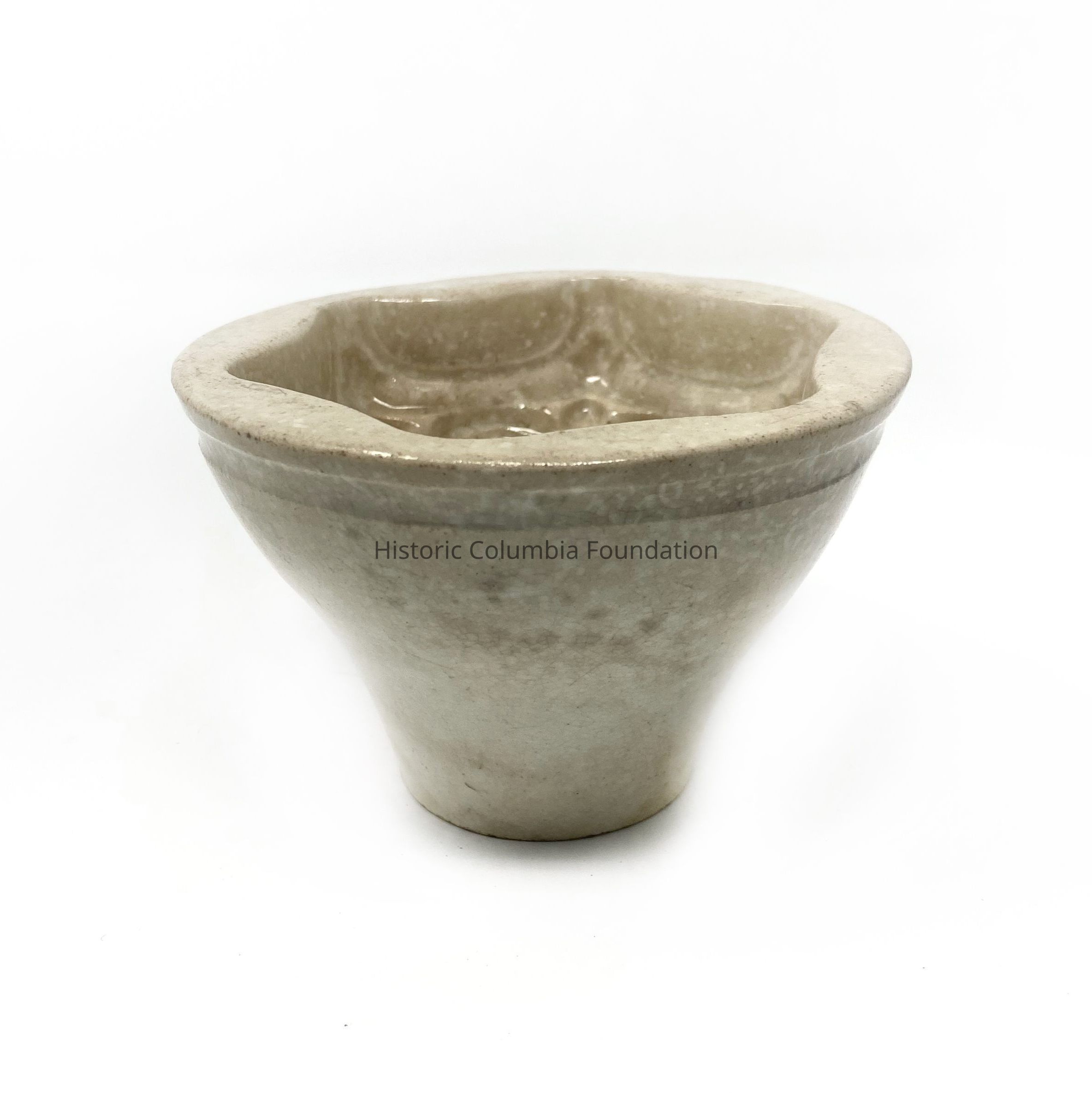 Ceramic stepped hexagonal pattern pudding mold. It is covered in a pale cream glaze.Use