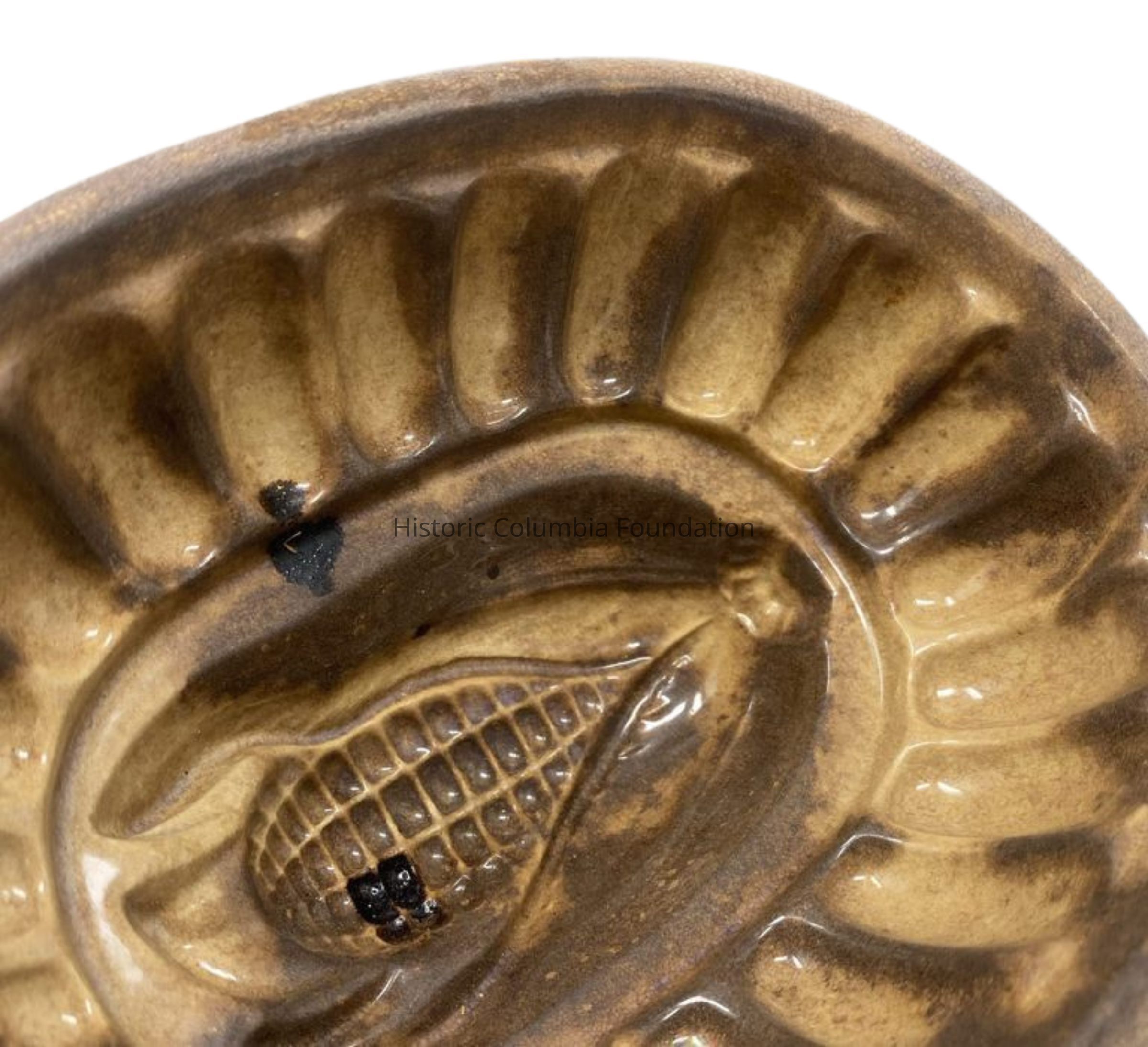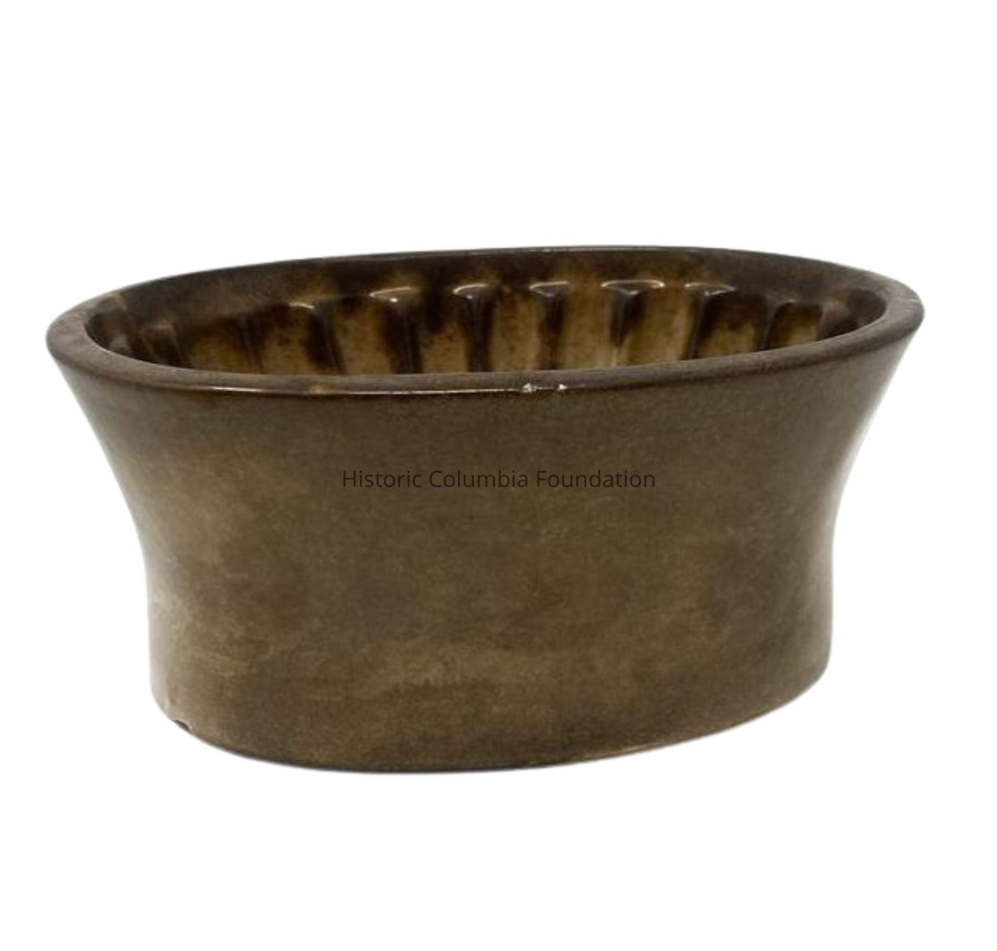 Ceramic oval-shaped pudding mold. It has ribbed sides and features a corn cob pattern at its peak.Use