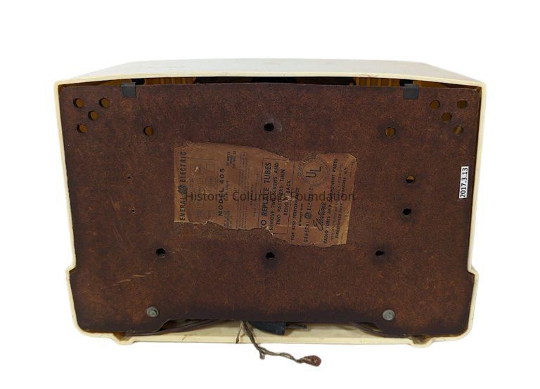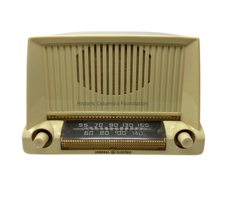 Rectangular ivory-colored table radio. The top half of the plastic radio front features an oval hole and vertical lines. The lower half includes two knobs as well as radio frequency numbers 55, 70, 90, 130, and 160 above the line and 60, 80, 100, and 140 below the line. Underneath this, the name "GENERAL ELECTRIC" and the company logo appear in gold letters. The back of the radio includes a GE sticker and an opening for the power cord.