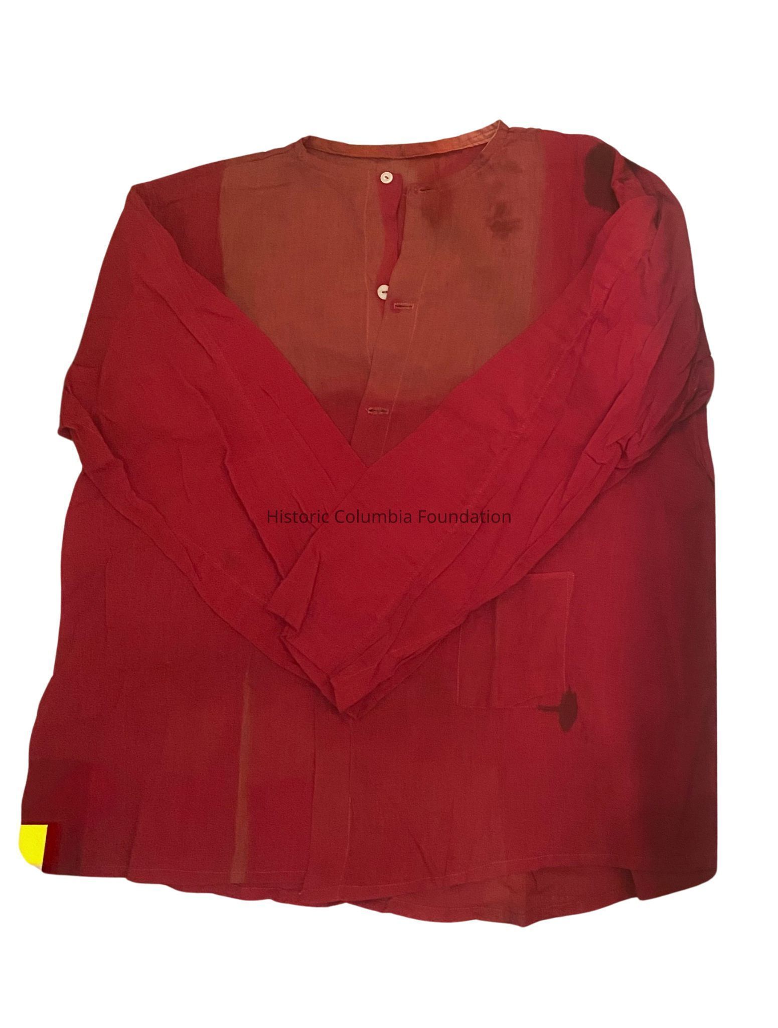 Plain, red cotton shirt with white buttons down the center. There is a single pocket on the left side of the shirt. A more faded red fabric was used around the chest of the shirt. There are a few stains on the shirt, including one near the left shoulder and one near the bottom of the pocket. The shirt appears to be sewn together by a sewing machine.
