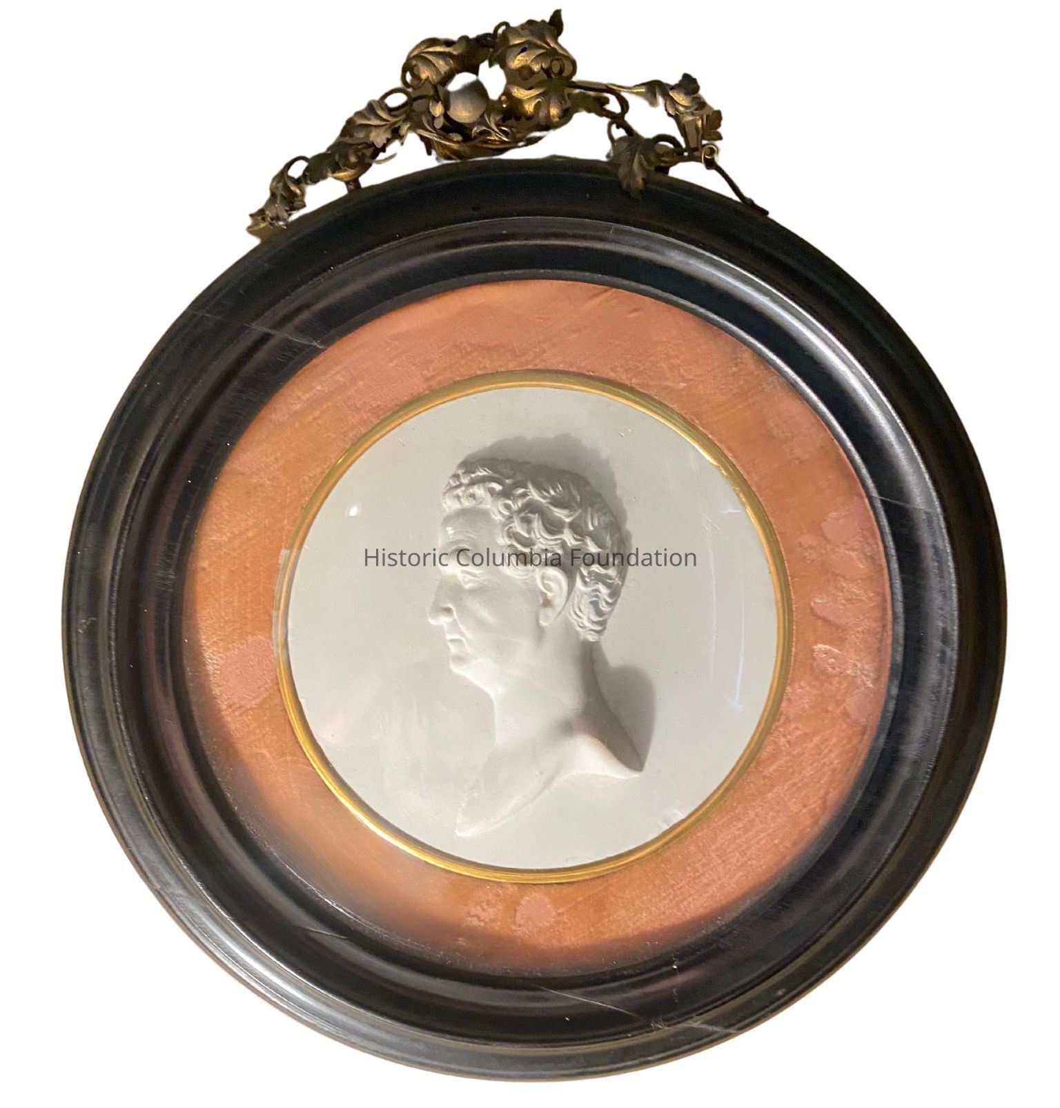 Plaster relief medallion of a man's bust facing the viewer's left. The relief is contained in a circular ogee frame with a faded rose-colored velvet inner frame and convex glass. The crown of the frame is ornate with a metal oak leaf cluster.Type of Sculpture