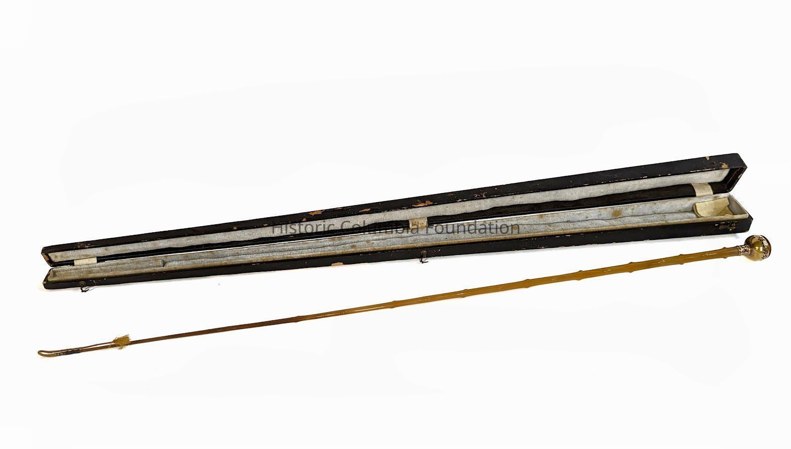 Riding crop with case. The crop's shaft is a golden color and contains a hinged gold dome top with black stylistic flowers. The writing around the base of the dome reads "BUCKIE." The case is black with three hooks to hold the case closed.Context