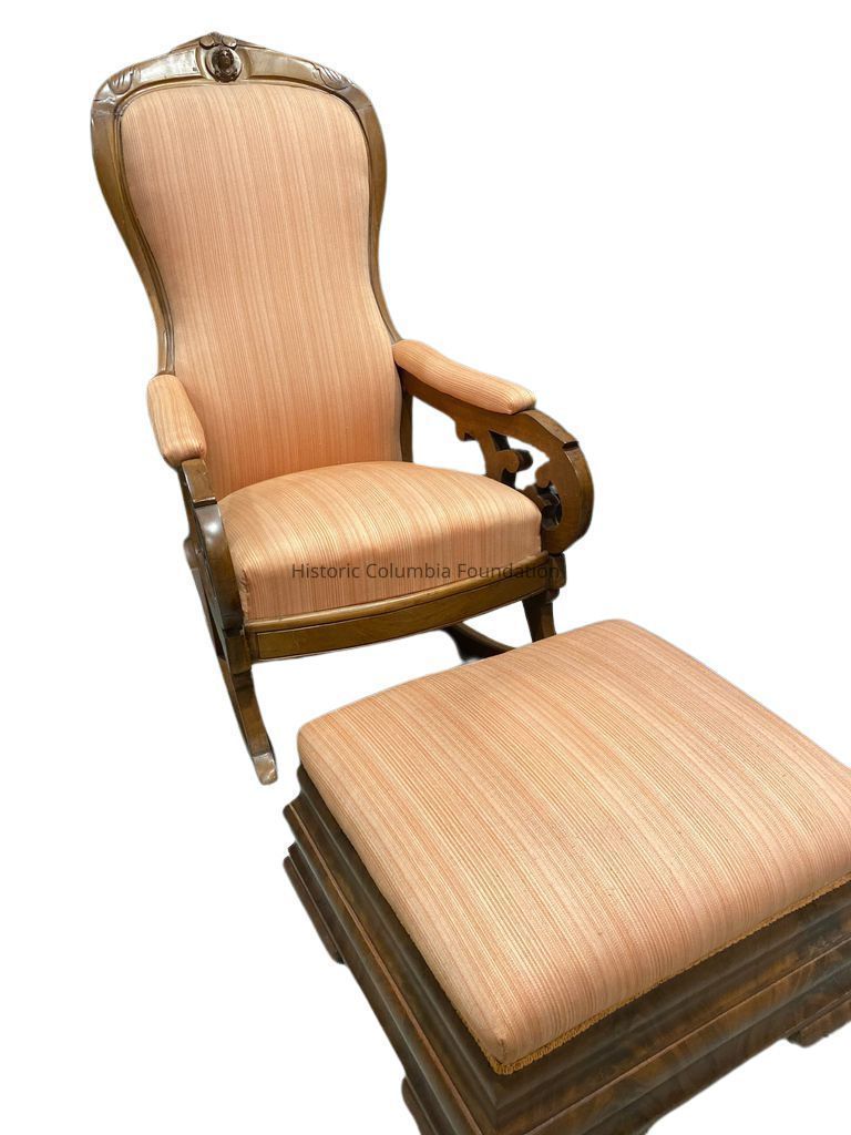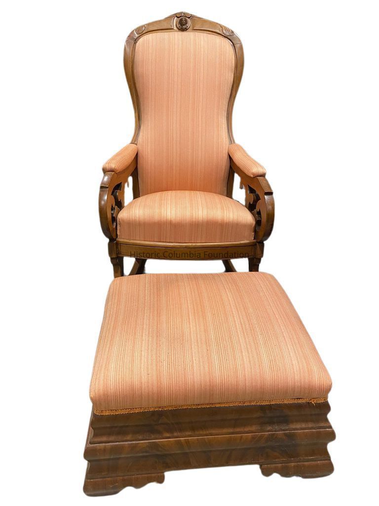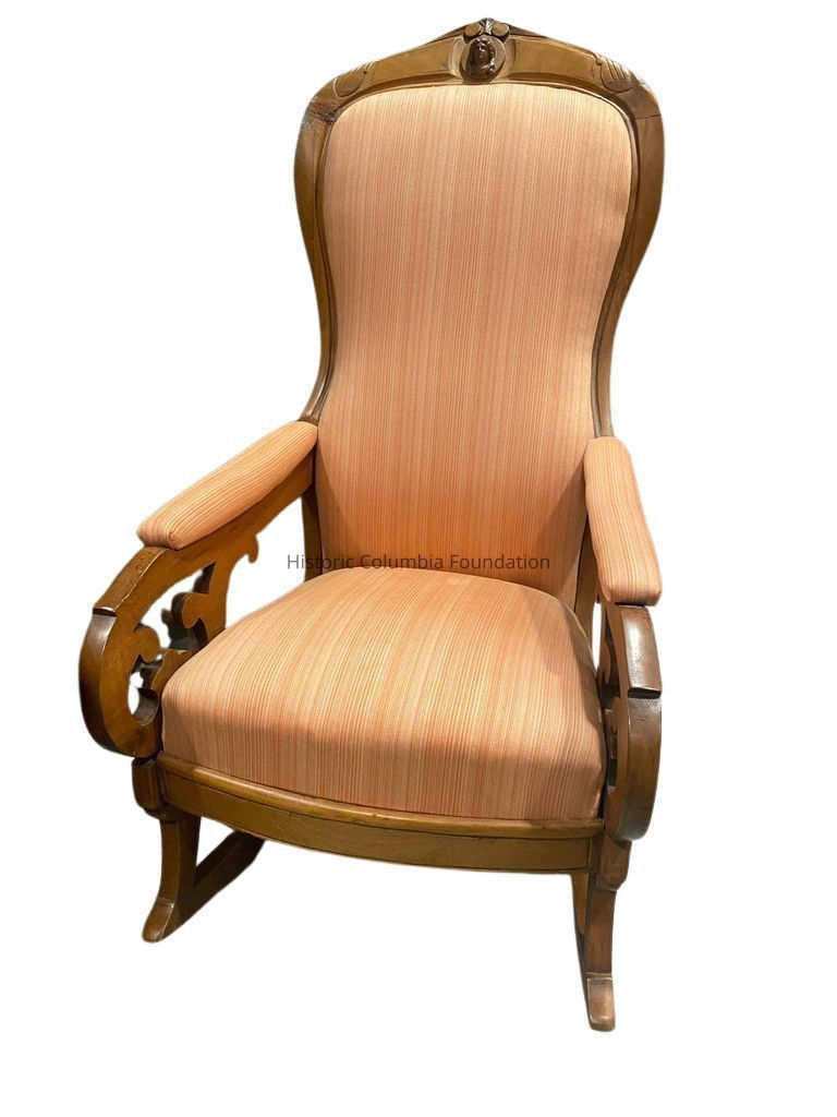 This chair has historically been attributed to cabinetmaker Milo Hoyt Berry (1819–1907), who came to the South from Newark, New Jersey in 1843. After settling in Columbia around 1845, Berry established a furniture and undertaking business in the city. Despite numerous fires and the destruction of his cabinet shop and warerooms during the Civil War, Berry operated at 107 Main Street (later renumbered 1440 Main Street) from c.1850 to 1903.