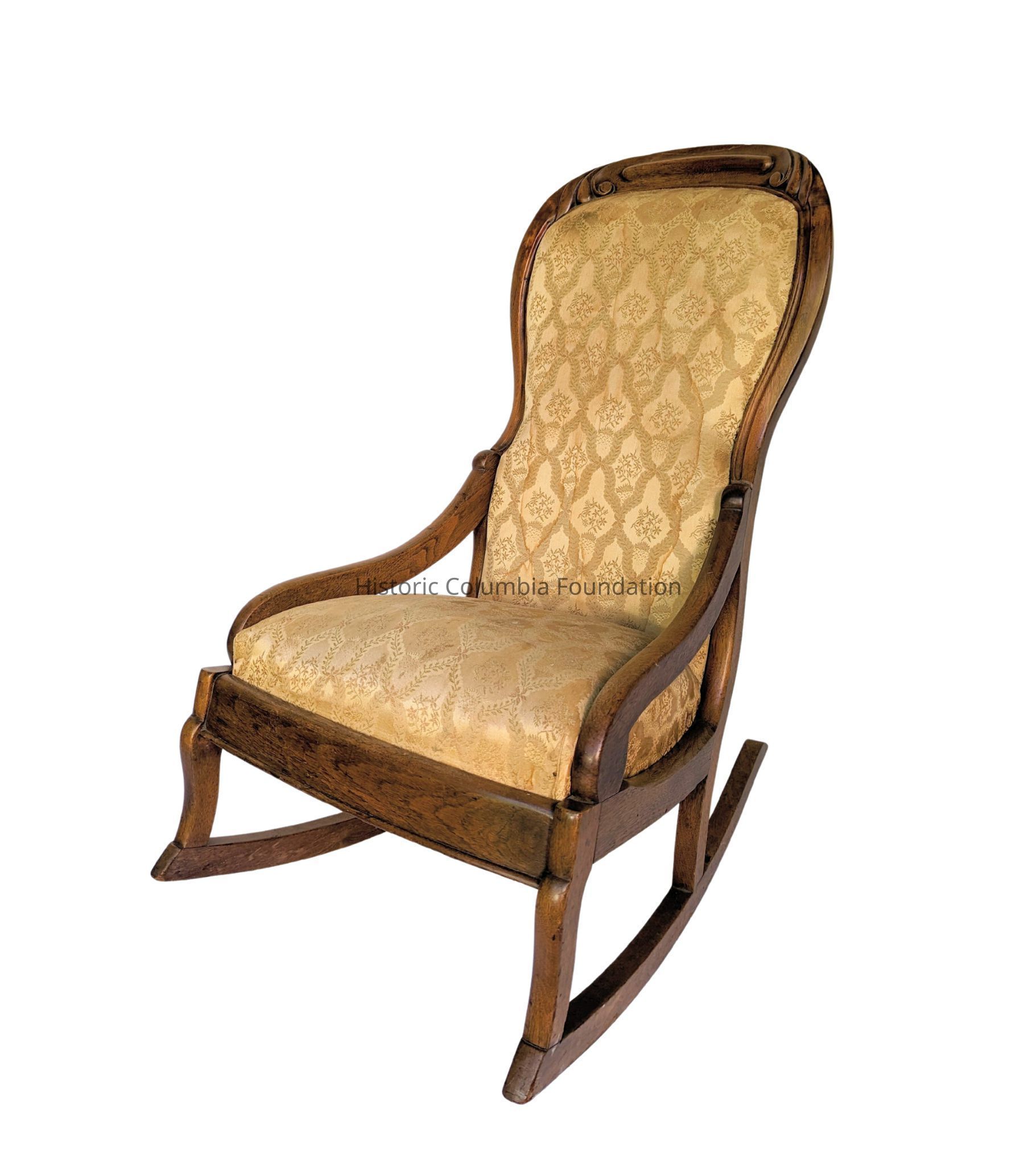 Small walnut rocking chair with gold brocade upholstery. There is a simple floral carving near the top on the back.Context