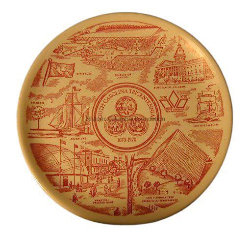 South Carolina tricentennial commemorative whiteware dinner plate. The plate contains a red transfer print design depicting the three tricentennial exposition centers (Charleston, Columbia, and Greenville); the South Carolina State Capitol; the South Carolina tricentennial logo; and the state seals, tree, and flag. The rear of the plate features three stilt marks left over from the firing process.Context