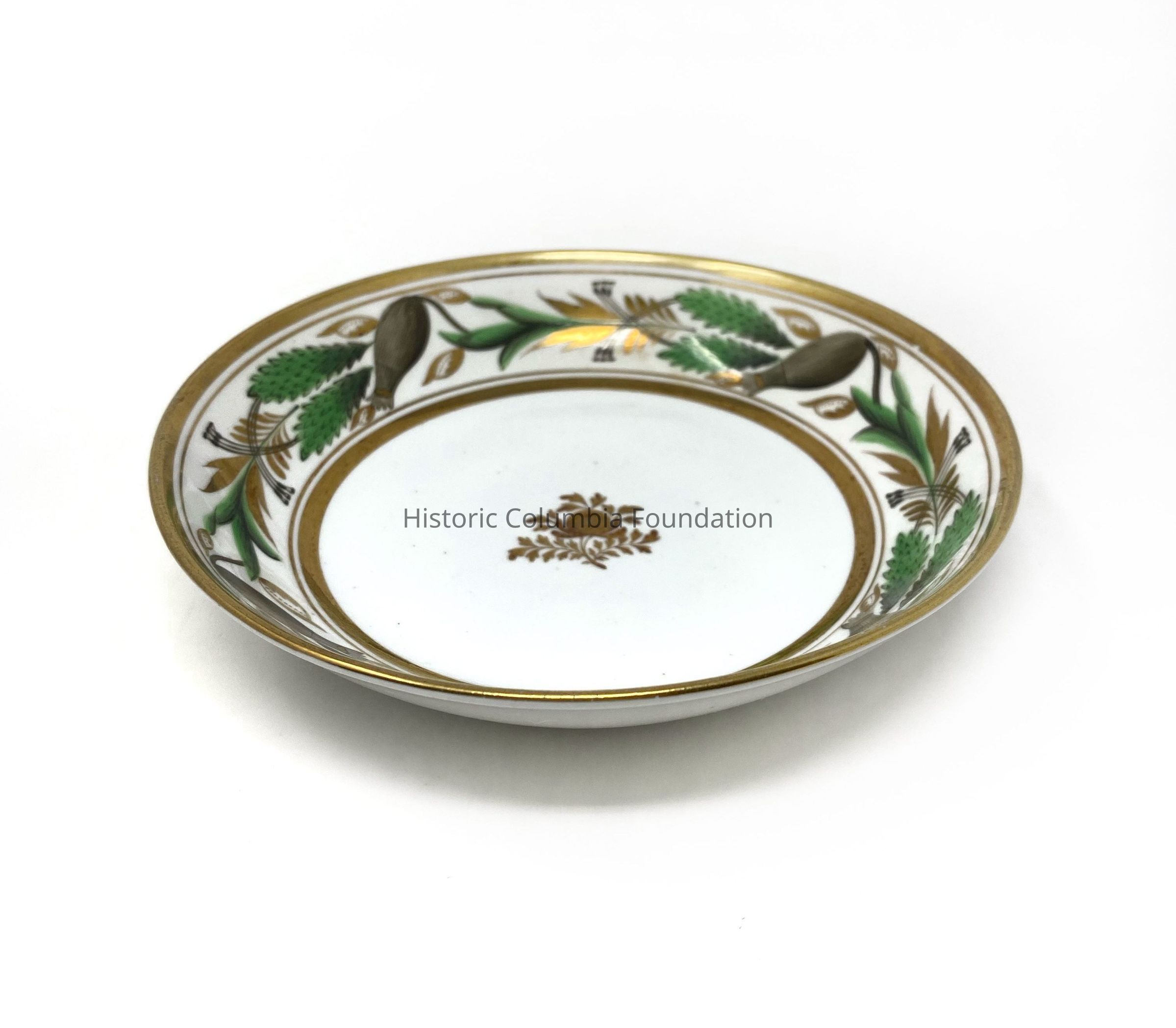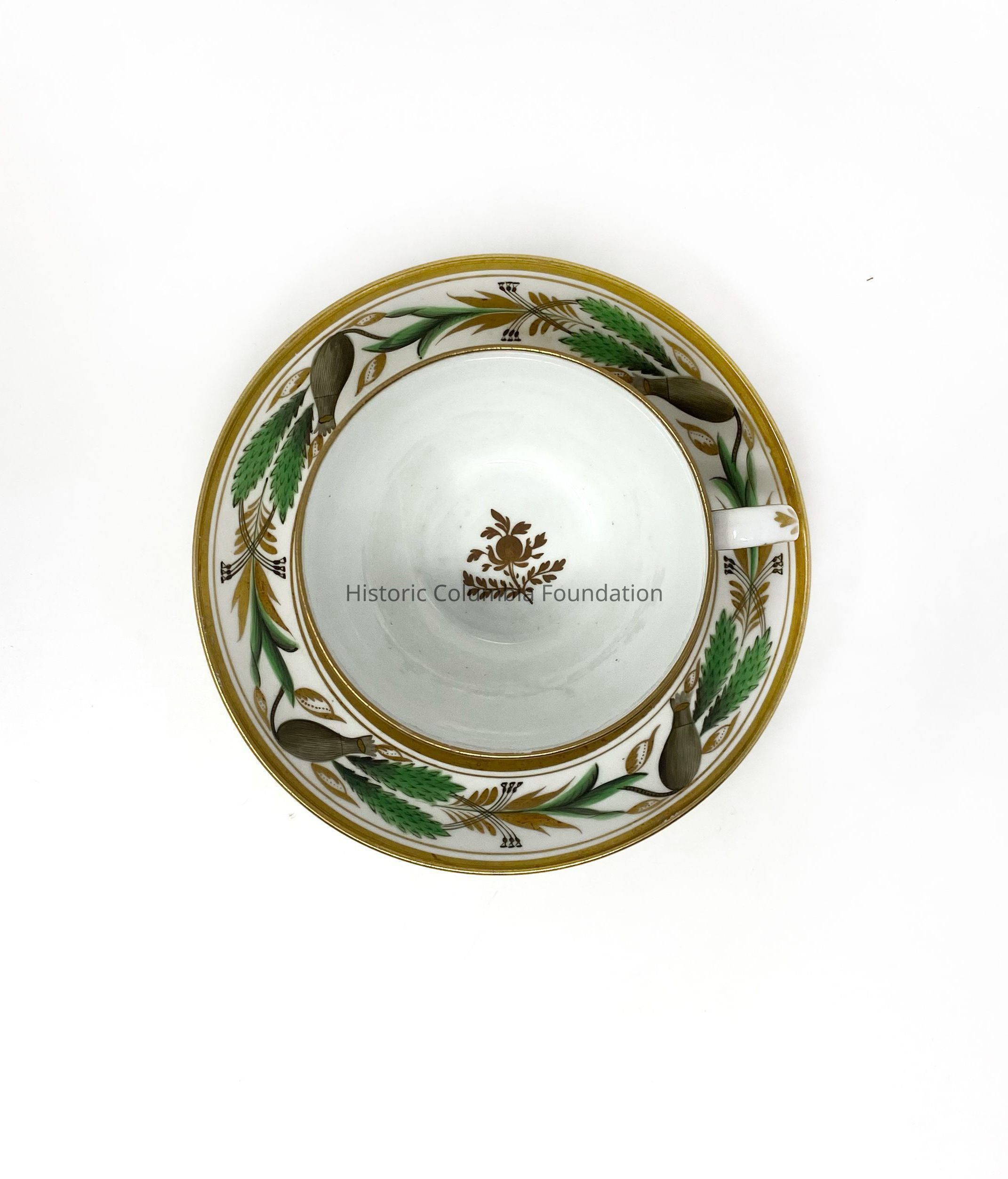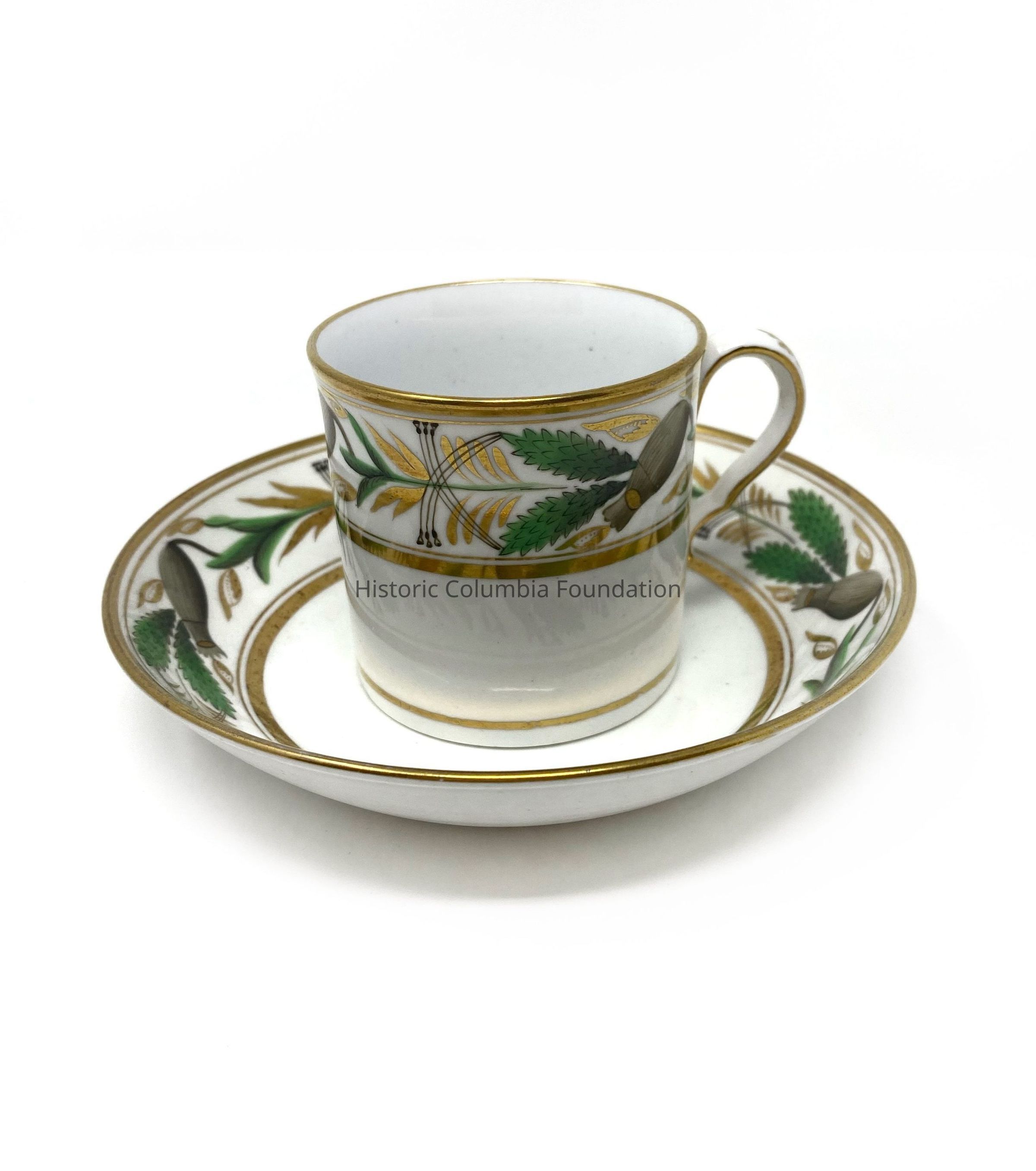 Seventeen white ceramic saucers with gold banding. Each features a green and brown leaf motif design. The center of each saucer has a golden leaf design. "Spode 357 9" is written on the bottom of the majority of the cups (A,B,C,I,J,K,L,M,O,P) while some of the cups say "357" on the bottom (D,H,N).Context
