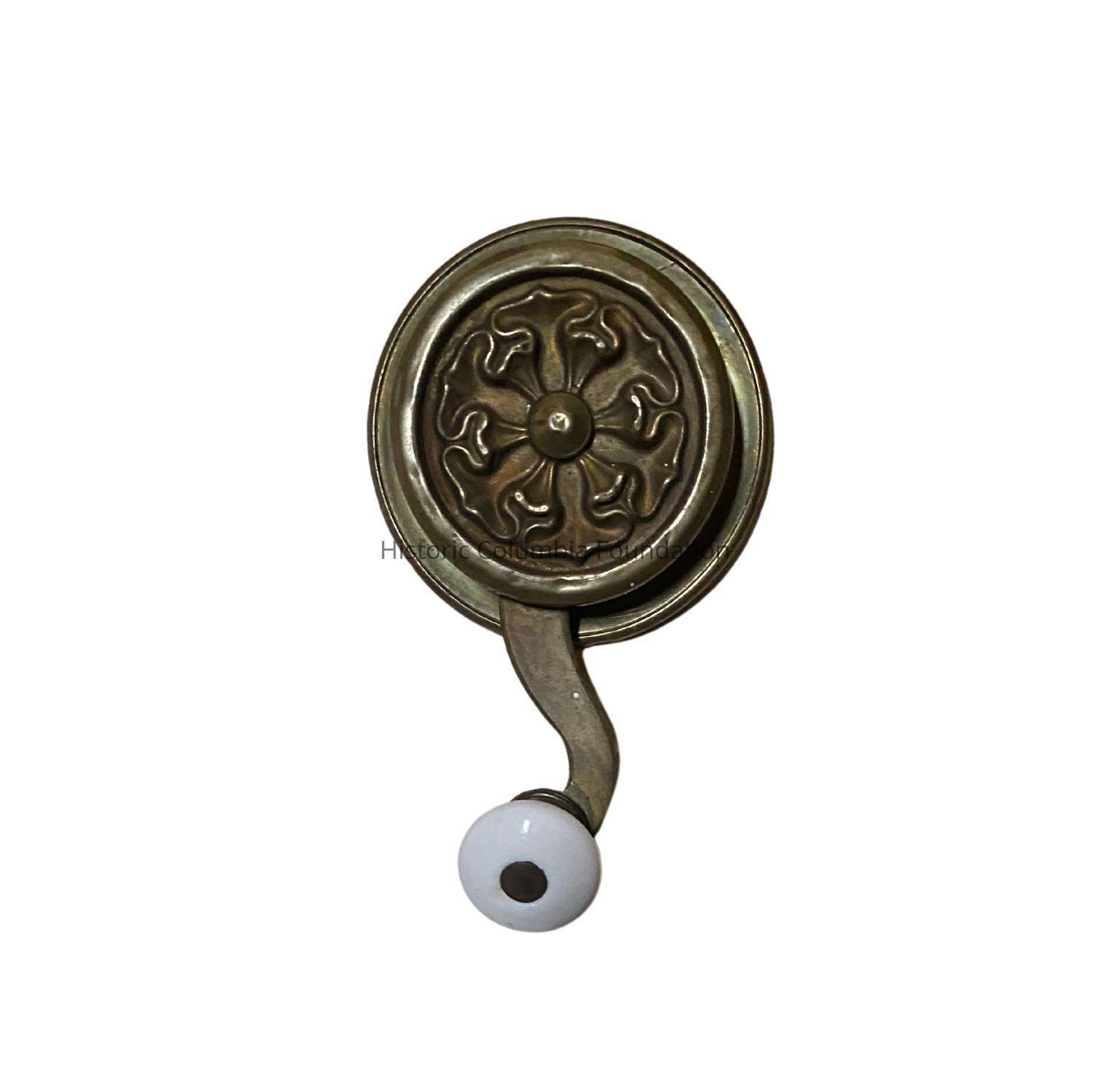 English bellpull made of brass and ceramic. It is circular with a raised chain containing a variation of a Rose of York design. It has a shaped arm with a white ceramic handle.Use