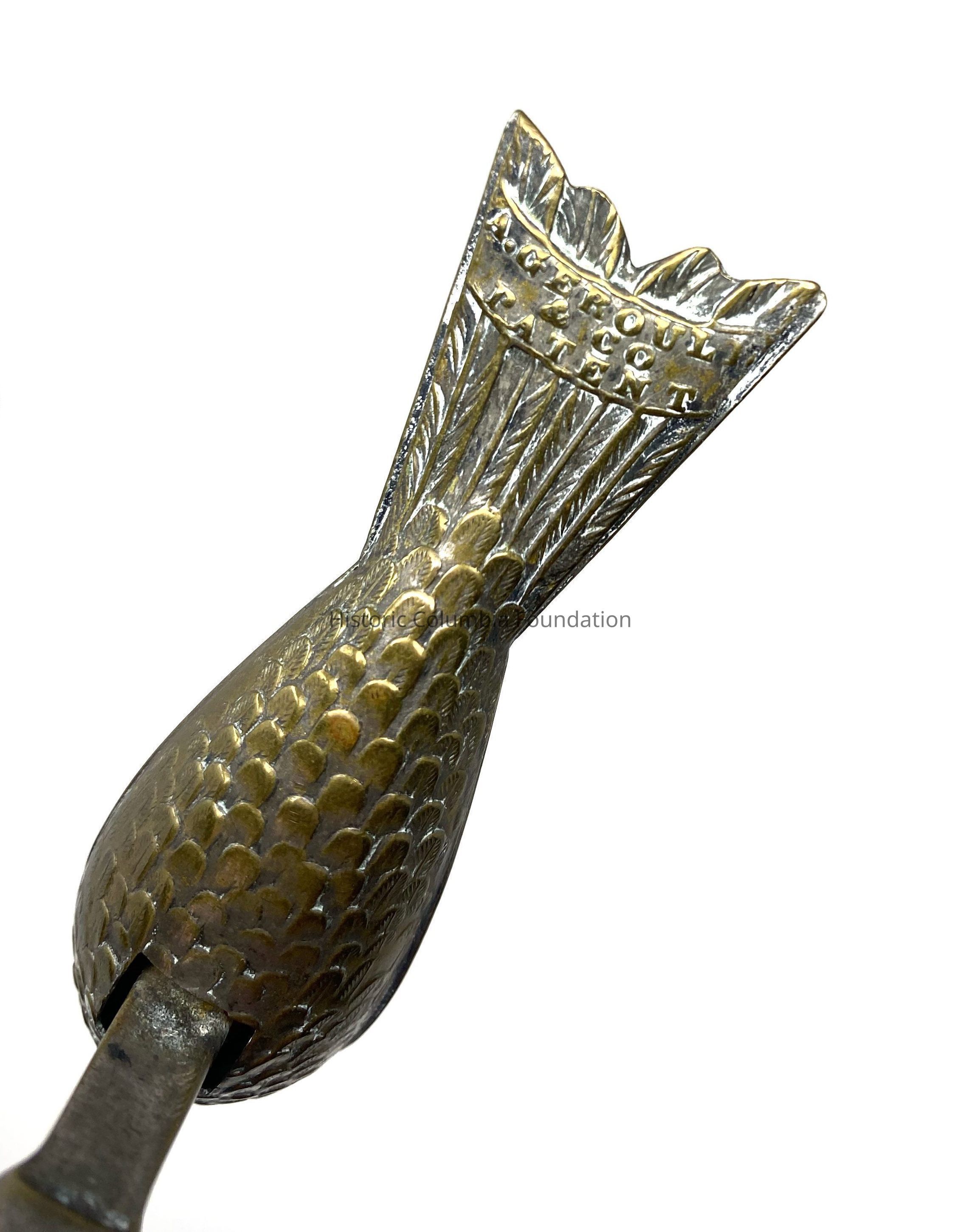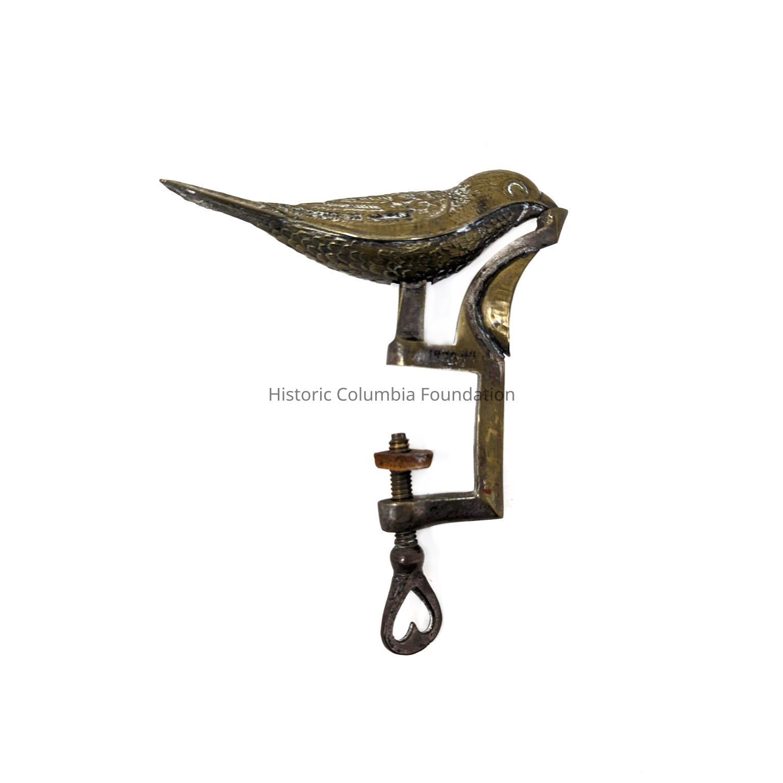Although very ornamental, this sewing bird has a simple purpose: to secure fabric in order to keep it taut. Later known as a third hand sewing clamp, this device attaches to a table top or other stationary surface via the large, adjustable screw. The bird's beak acts as a "third hand" by holding the fabric, only releasing it for adjustments when the button on the handle is pressed.Context