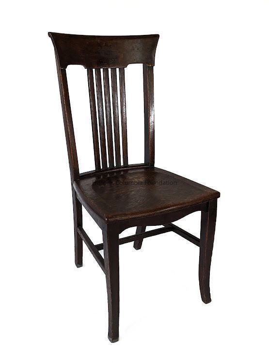 Oak side chair. The chair is dark brown with five vertical-slats grouped together on the back and a cross stretcher supporting the legs.Furniture Details