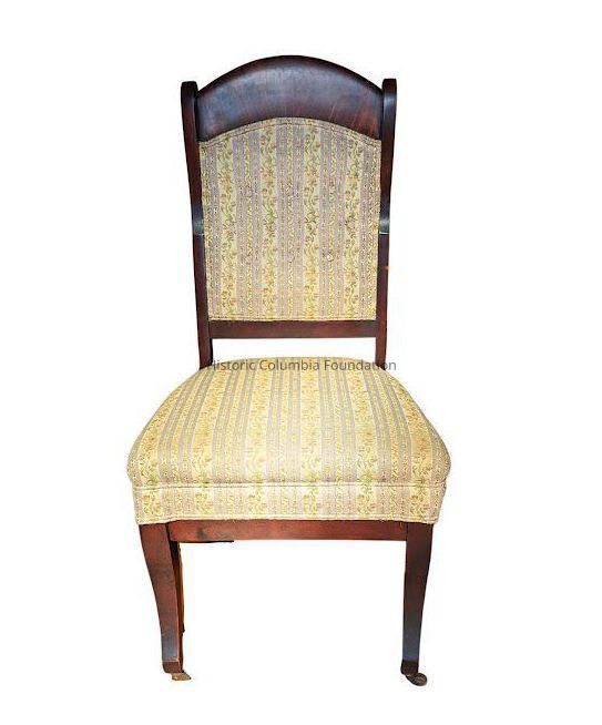 Middle- and upper-class homes during the Victorian era owned a parlor set comprised of specific pieces of furniture, including various types of chairs and a sofa, that was purchased for entertaining guests in the public space of a home. This set of chairs are part of a four-piece rosewood set and features simple lines rather than the intricate, carved detailing from decades prior. The Simons family likely purchased it in the 1890s from one of the many retail furniture stores in Columbia for use in the Mann-Simons family home at 1403 Richland Street. In keeping with the gender-specific use of parlor set pieces, these chairs would have been used by the ladies of the household.Furniture Details