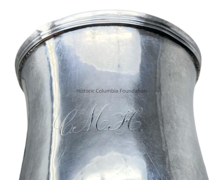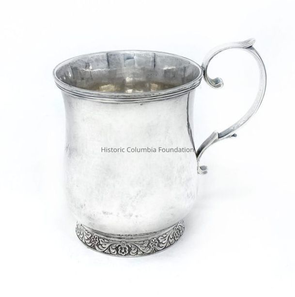 Cann made of American coin silver. It is traced around the bottom and has a scroll handle. It is engraved "CMH."Use