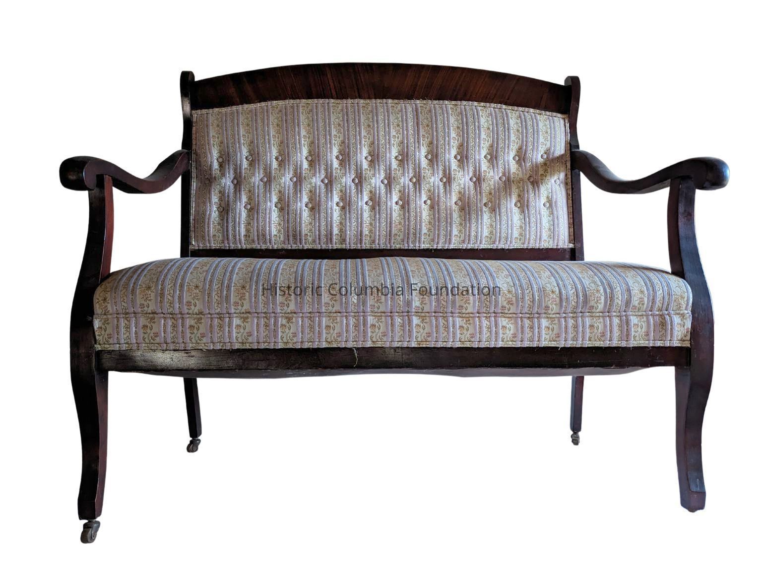 Middle- and upper-class homes during the Victorian era owned a parlor set comprised of specific pieces of furniture, including various types of chairs and a sofa, that was purchased for entertaining guests in the public space of a home. This sofa is part of a four-piece rosewood set and features simple lines rather than the intricate, carved detailing from decades prior. The Simons family likely purchased it in the 1890s from one of the many retail furniture stores in Columbia for use in the Mann-Simons family home at 1403 Richland Street.Dimensions