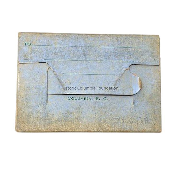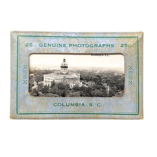 Small cardboard box of photographs. The box is a light blue shade with green text that reads "25 Genuine Photographs 25c Columbia, S.C.," on the front. The reverse reads "Grogan Photo Service, Inc. 21st & Troy Streets. Chicago, IL., Central News Company. 1217 Lincoln Street. Columbia, S.C." The reverse includes space to address the box to someone.