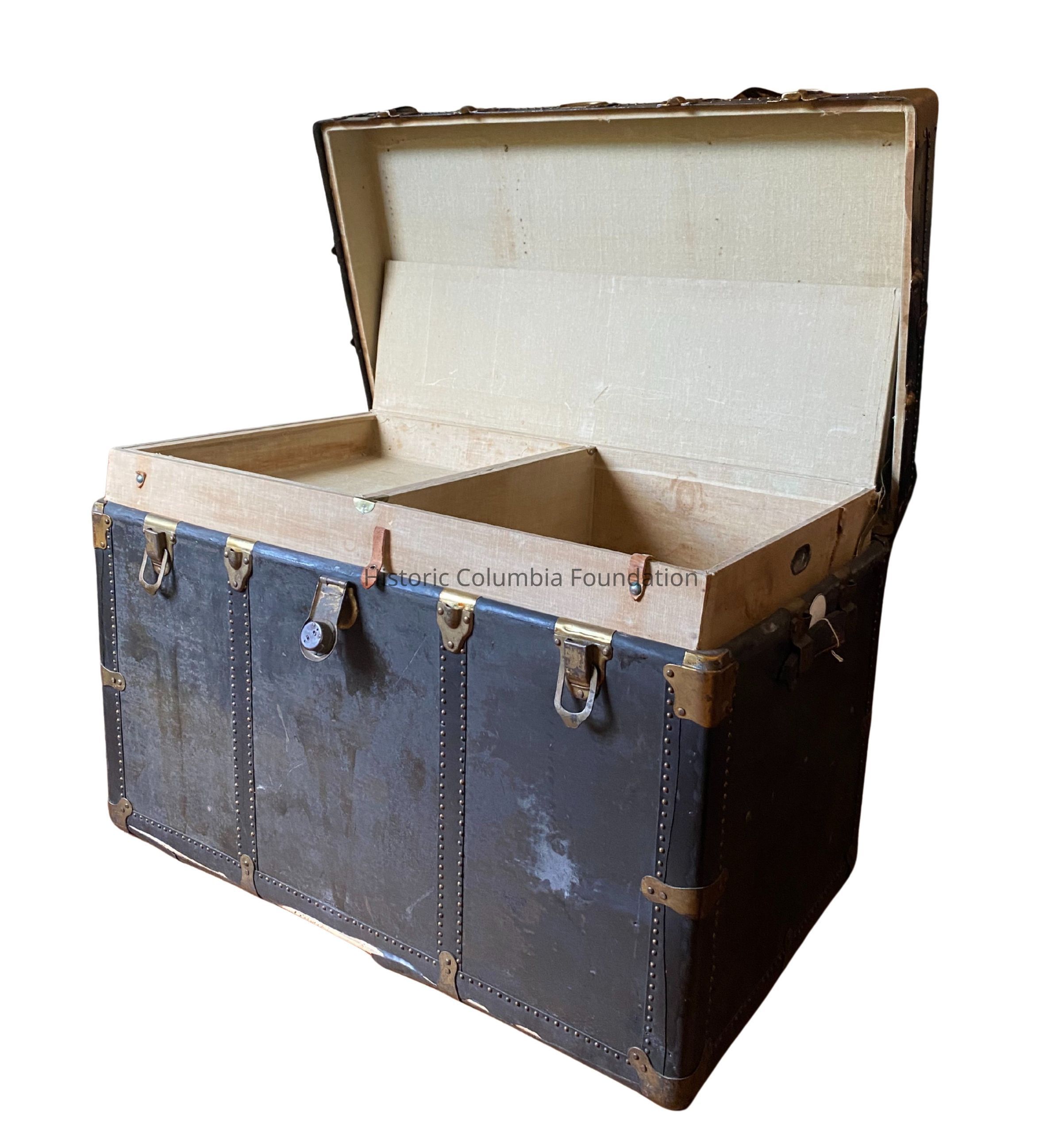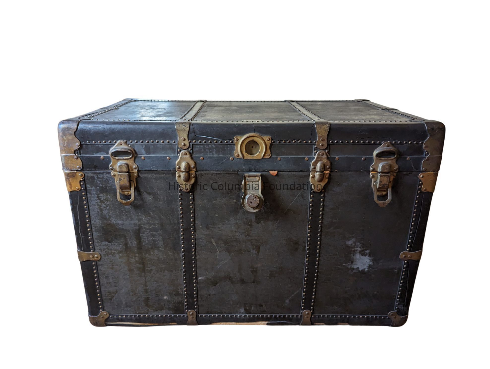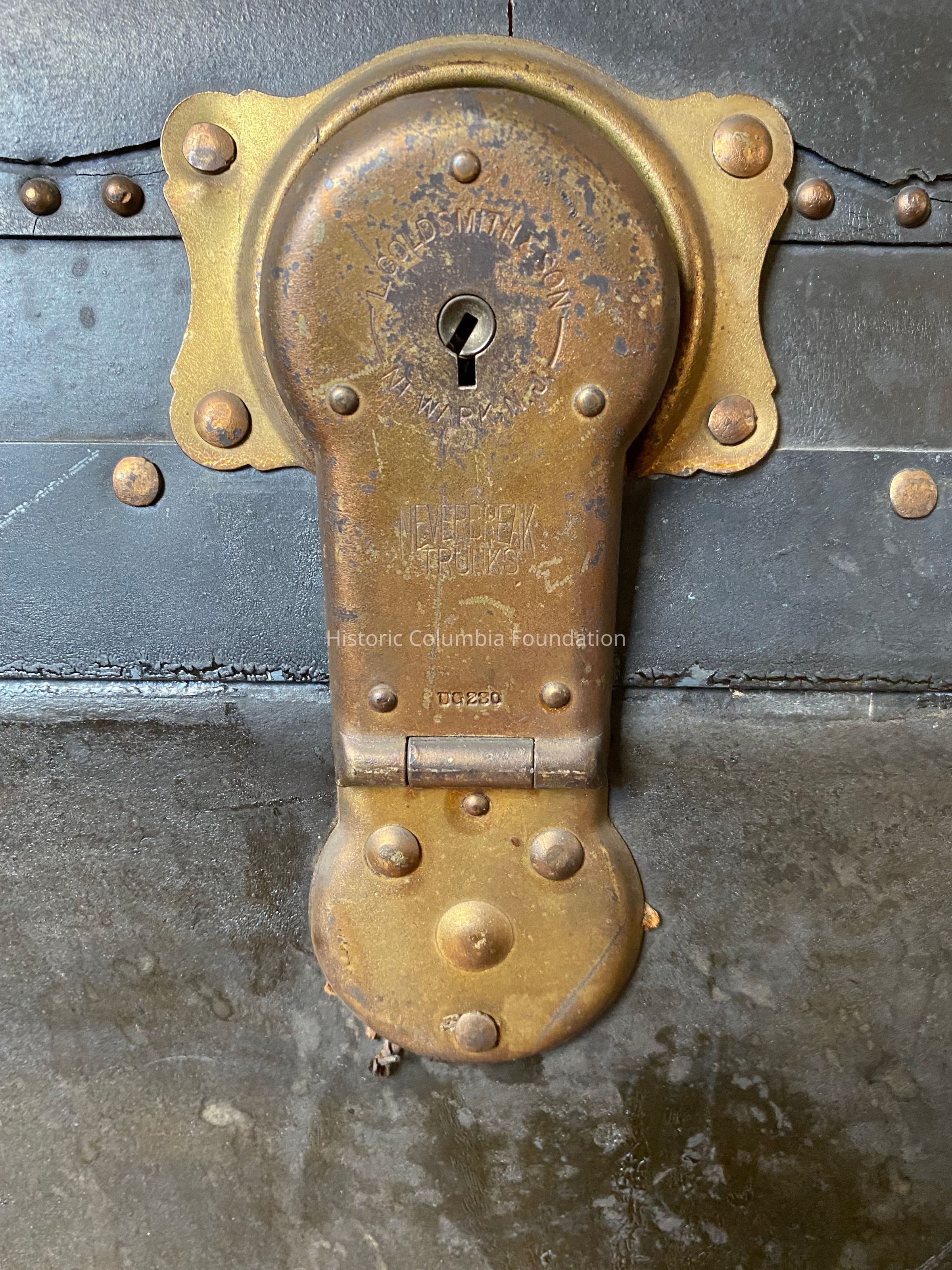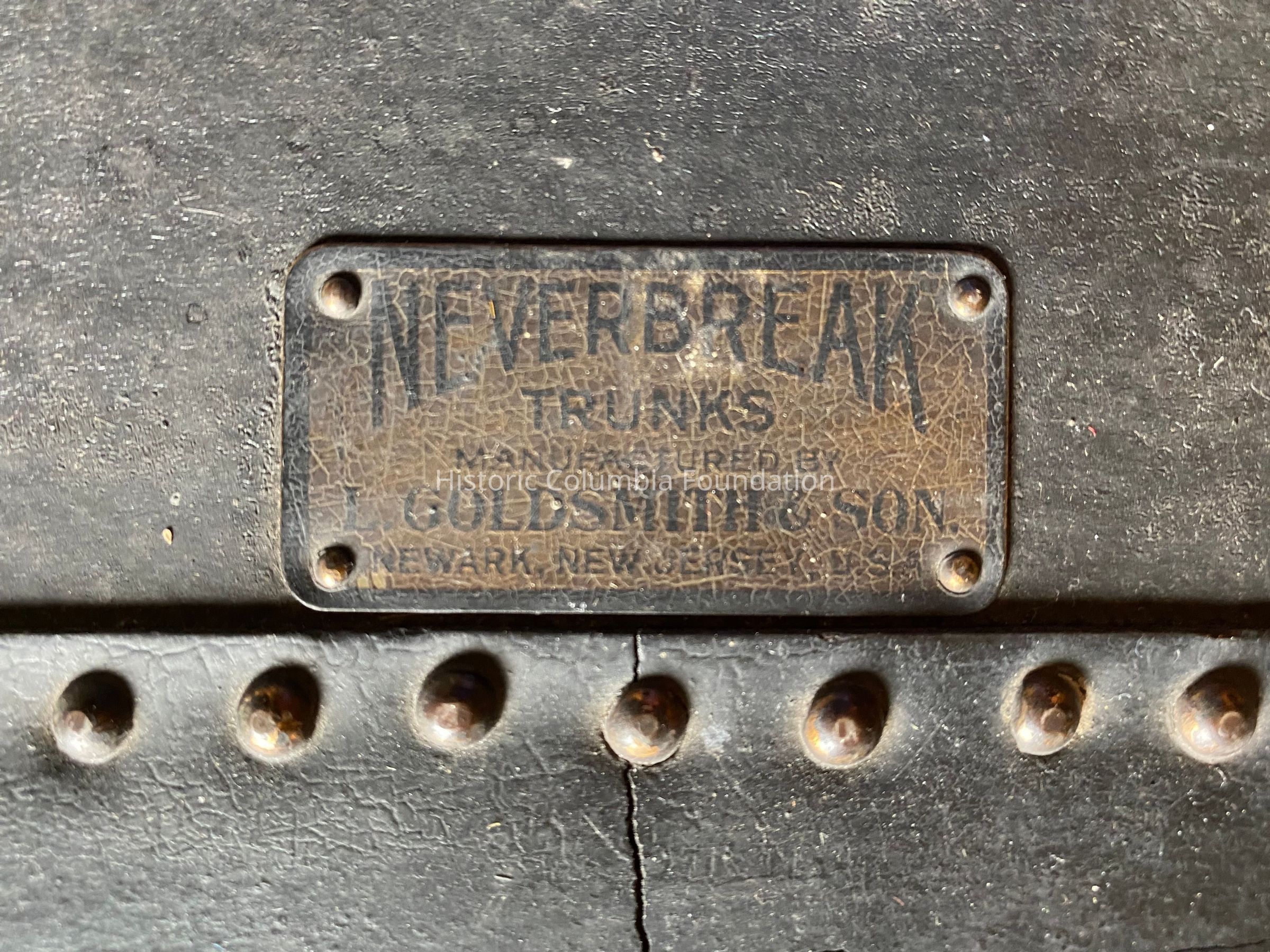 Black steamer trunk with metal hardware and leather handles. It contains three removable shelves on the interior covered in beige fabric. A metal plate on the top of the trunk reads, "NEVERBREAK TRUNKS / MANUFACTURED BY/ L. GOLDSMITH & SON / NEWARK, NEW JERSEY, U.S.A." The lock on the front of the trunk is similarly inscribed, "L. GOLDSMITH & SON / NEWARK, N.J. / NEVERBREAK TRUNK," along with "UG230" in smaller letters.Made/Created
