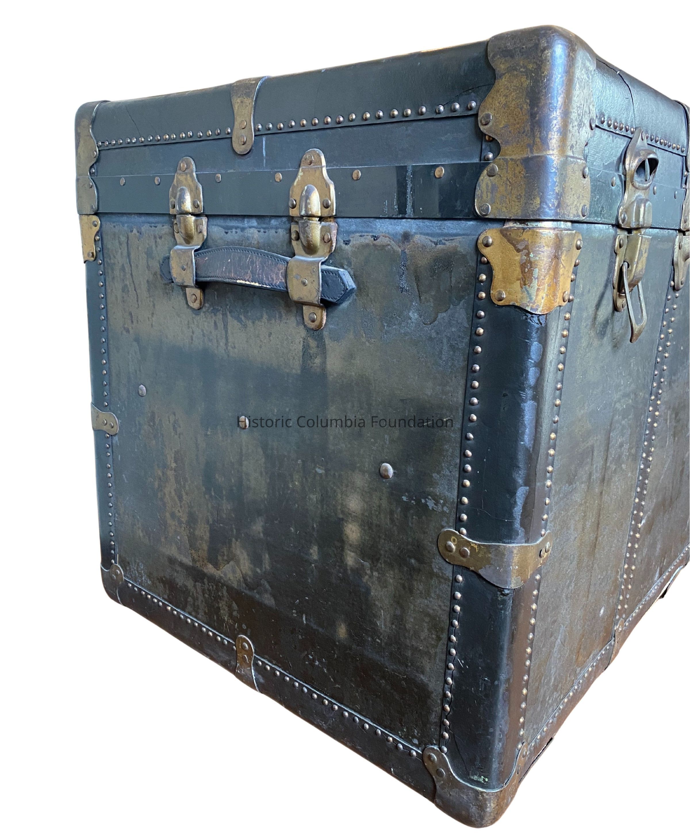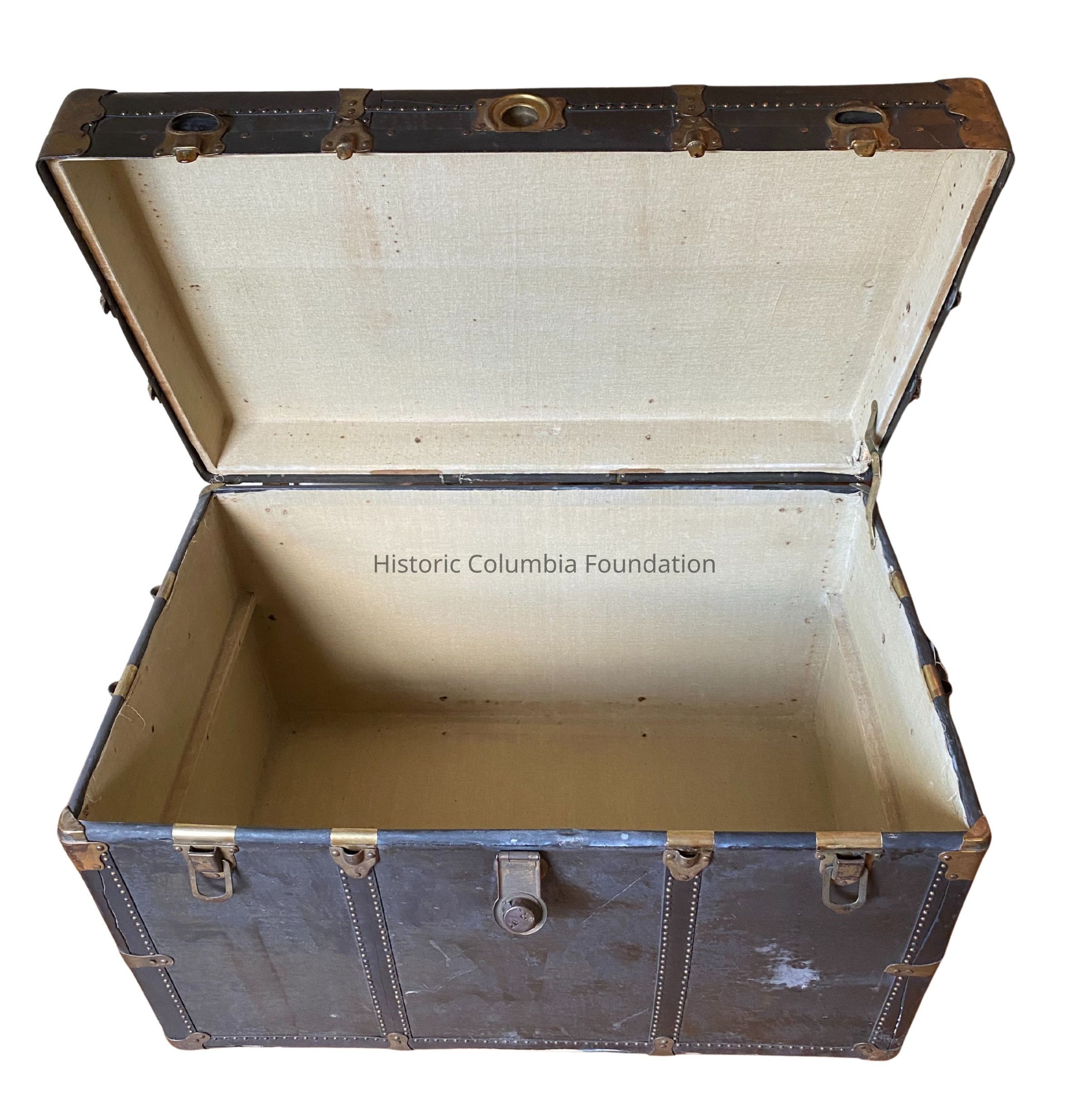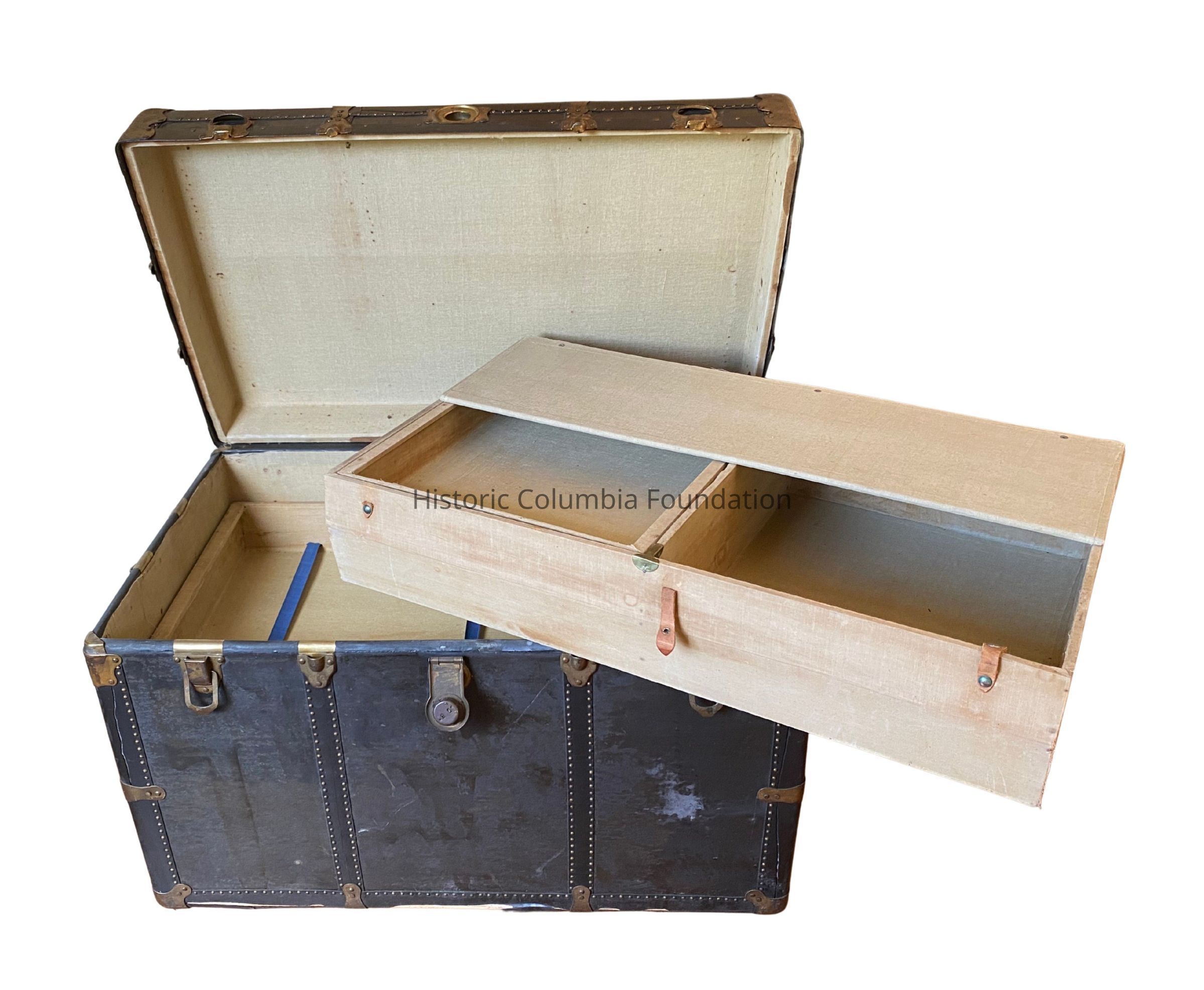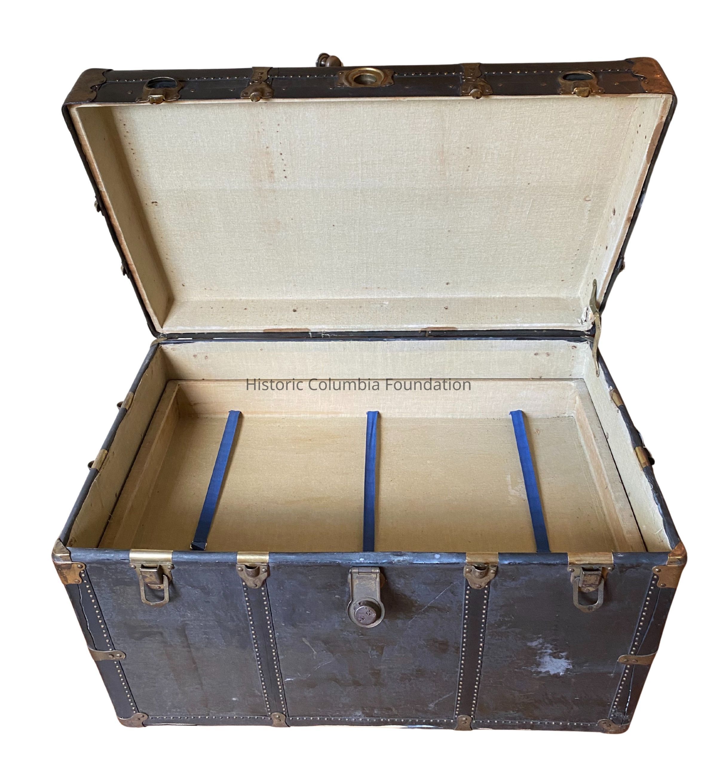 Black steamer trunk with metal hardware and leather handles. It contains three removable shelves on the interior covered in beige fabric. A metal plate on the top of the trunk reads, "NEVERBREAK TRUNKS / MANUFACTURED BY/ L. GOLDSMITH & SON / NEWARK, NEW JERSEY, U.S.A." The lock on the front of the trunk is similarly inscribed, "L. GOLDSMITH & SON / NEWARK, N.J. / NEVERBREAK TRUNK," along with "UG230" in smaller letters.Made/Created