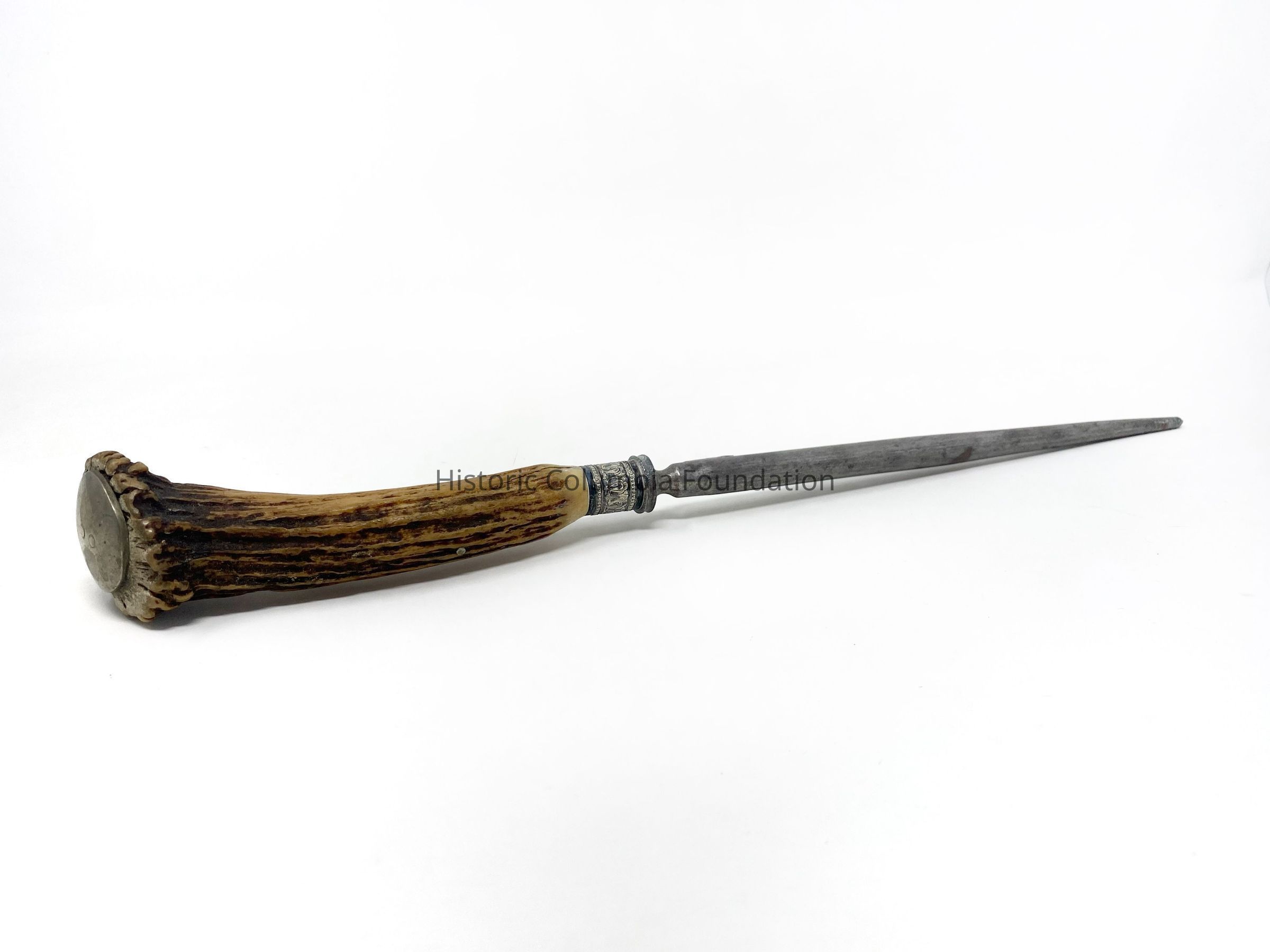 Steel knife sharpener with antler handle and metal end button. The band around the handle features and egg and dart style of decoration and a tulip motif on the collar. The sharpener is marked "Joseph Rodgers & Sons."Context