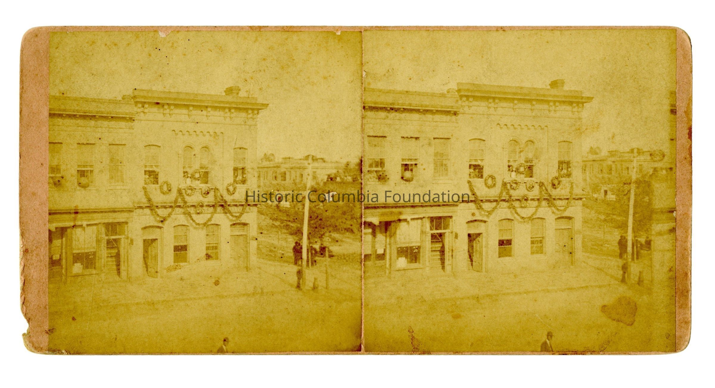This stereograph depicts Edwin J. Scott's (1803-1884) bank building, located at 101 Richardson Street (1432 Main Street) in Columbia. Scott later authored the memoir "Random Recollections of a Long Life, 1806 to 1876," which documents various anecdotes in Columbia's history. Garlands festoon the front of the building, along with what appears to be a portrait of Wade Hampton III (1818-1902). The photograph likely dates to 1876 or 1877, during which General Hampton ran for and was eventually inaugurated as governor of South Carolina. Scott, a Democrat who wrote about the perceived corruption of the Reconstruction era legislature, was among Hampton's many supporters.