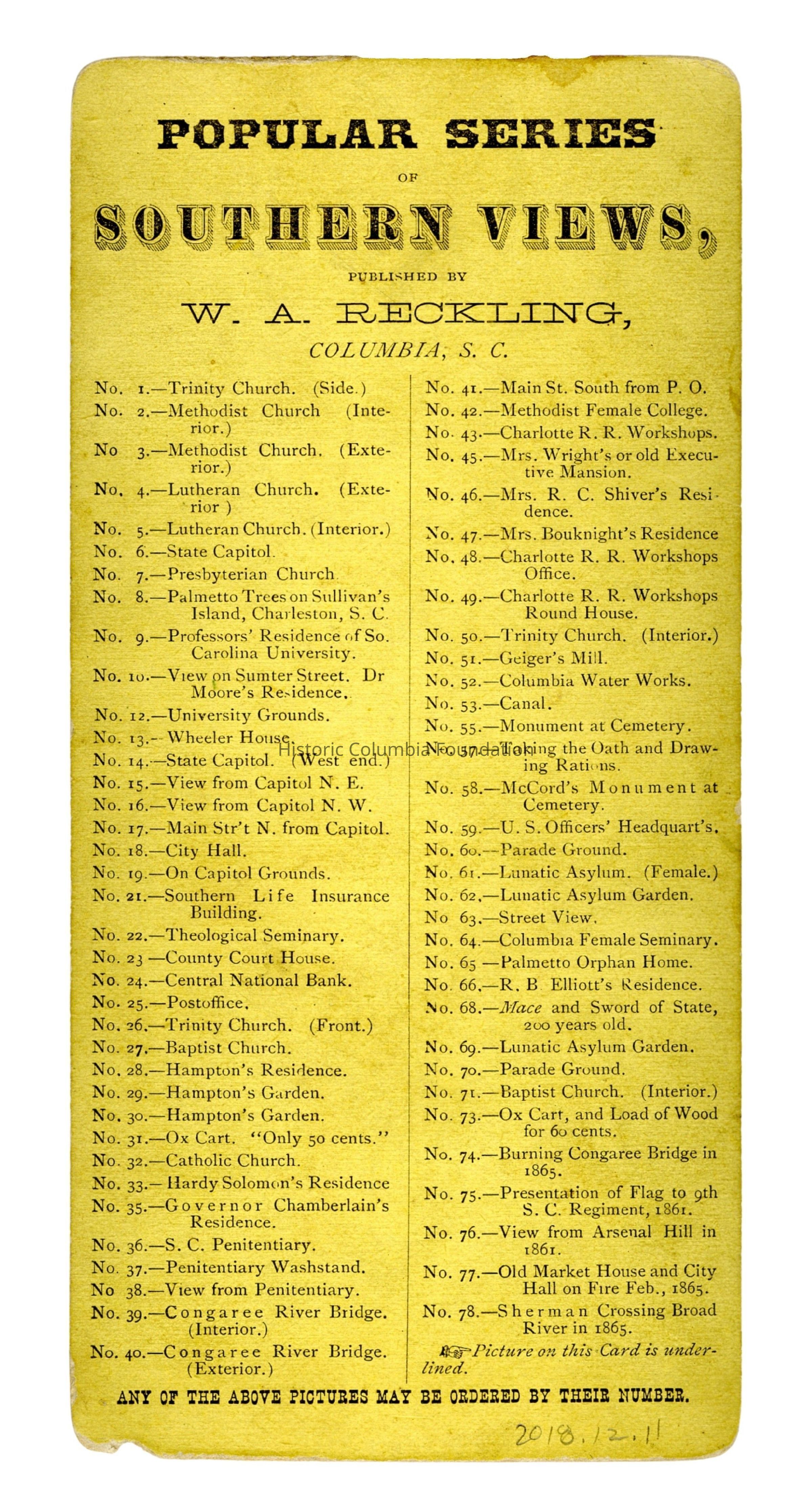 Austrian immigrant William A. Reckling (1849-1913) began his photography career as an apprentice with local Columbia photographers William Preston Hix (c.1836-1911) and Richard Wearn (1826-1874). In the early 1870s, he moved to Rome, Georgia, to establish his own photography gallery and business. After several successful years in Georgia, Reckling returned to Columbia in 1874. Opening a gallery at 110 1/2 Richardson Street (1435 Main Street), he became known as one of the South's preeminent photographers. Reckling's most well-known works are a part of his "Popular Series of Southern Views," which capture various views of Columbia. He would continue to operate his photography gallery until his death in 1913.Made/Created