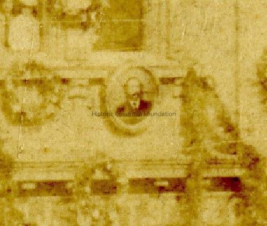 Stereograph by William Reckling from "Popular Series of Southern Views" series. Card shows a street corner with the sides of two buildings, each two stories tall. A portrait of Wade Hampton III is displayed on the side of the corner building. Wreaths and garland adorn the building. This stereograph does have the label on the reverse listing the series locations, but its title is not underlined.Photograph Details