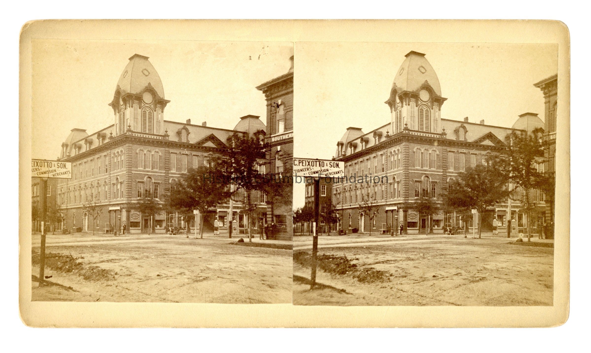 After the original City Hall and Market located on the northwest corner of Richardson (Main) and Washington streets burned during the Union Army's occupation in February 1865, the building featured in this stereograph by William A. Reckling (1849-1913) was erected at the same location as a replacement. A looming Italianate style landmark that dwarfed neighboring structures, this second city hall, completed in 1872, also featured an opera hall and commercial spaces on its ground floor. For some, the sprawling building embodied political corruption during the Reconstruction period. For others, the property was a destination for entertainment of all sorts. In March 1899, a tremendous fire destroyed the iconic building. Consumed in the flames were the city’s electric fire alarm, police headquarters, an armory, lodge rooms for various fraternal orders, the public library, and several businesses.