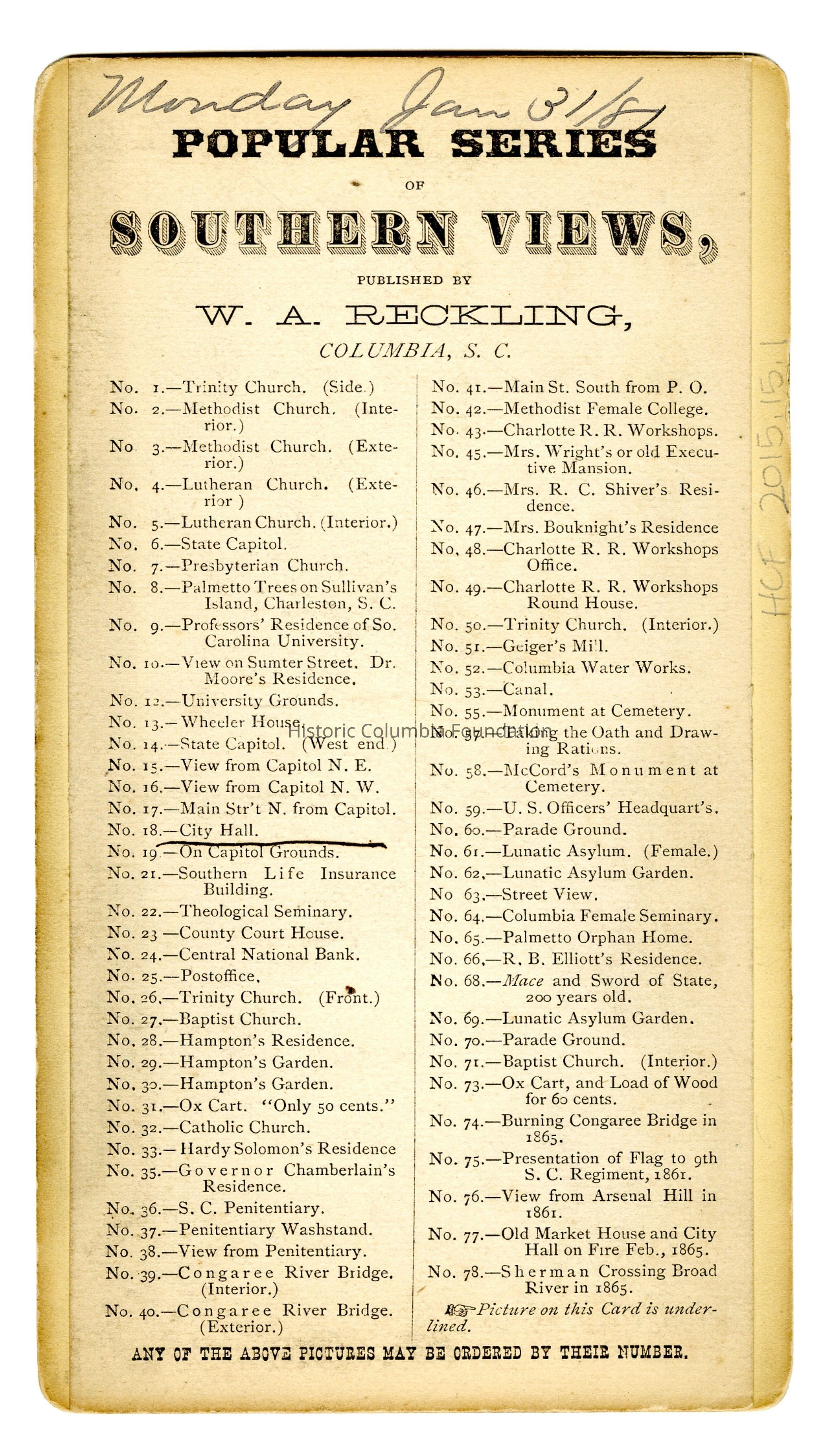 Stereograph of Columbia City Hall. The obverse has two images side by side of City Hall and the reverse has a label entitled "Popular Series of Southern Views, Published by W.A. Reckling Columbia, S.C." with a list of 78 images of buildings, structures, or daily scenes in the Columbia area. Handwritten at the top is "Monday Jan. 31/81," and the title of this work is underlined by hand.Photograph Details
