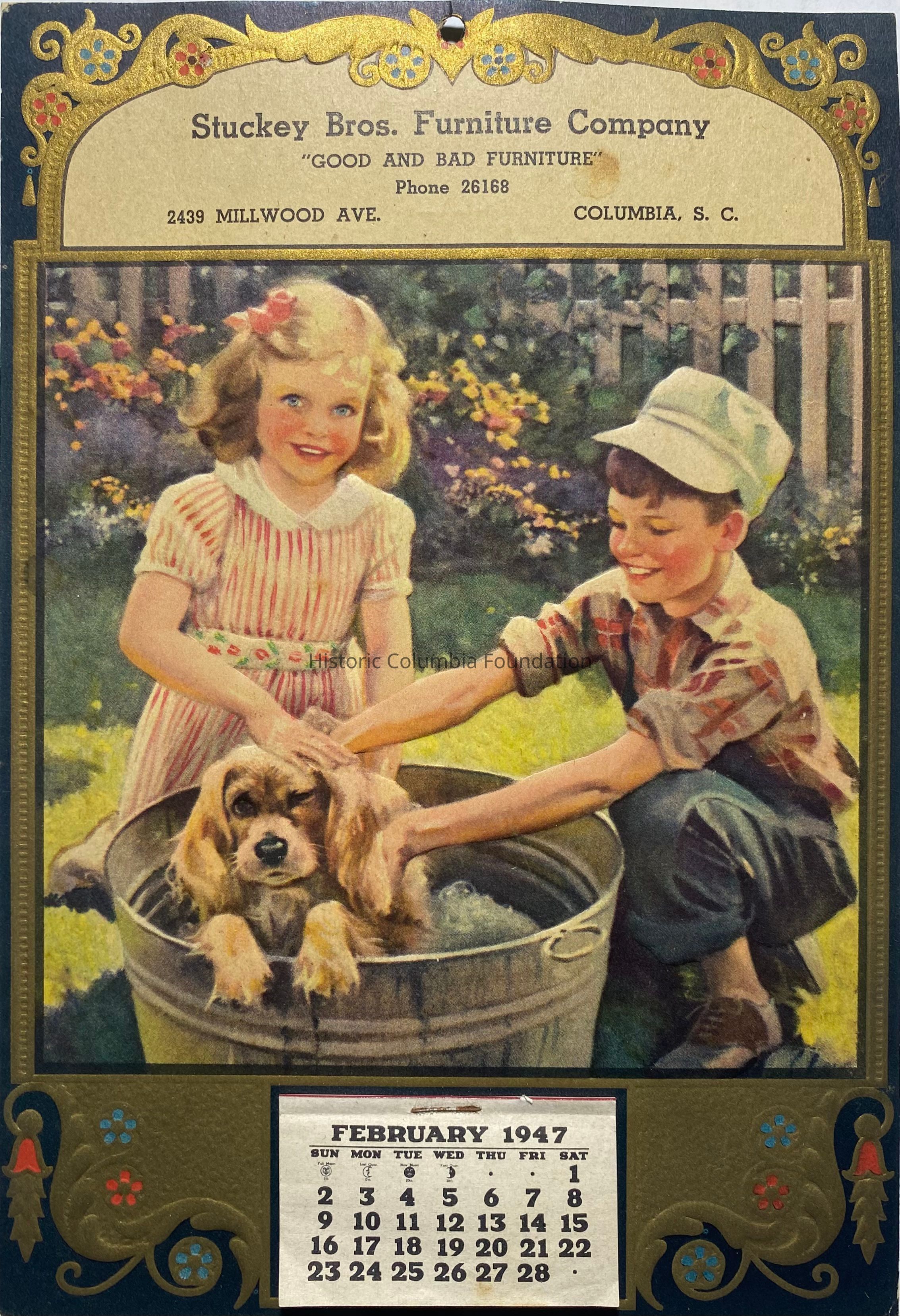 Paper calendar with a brightly colored picture of a young boy and girl bathing a small dog in a tin bucket in a garden. The girl is blonde with blue eyes, wearing a red-and-white striped shirt. The boy is wearing a green hat over his brown hair, a plaid shirt, jeans, and brown shoes. The border around the image is black with gold accents and floral designs. Near the top is advertising information, while the bottom contains the small, rip-away calendar missing the month of January.Context