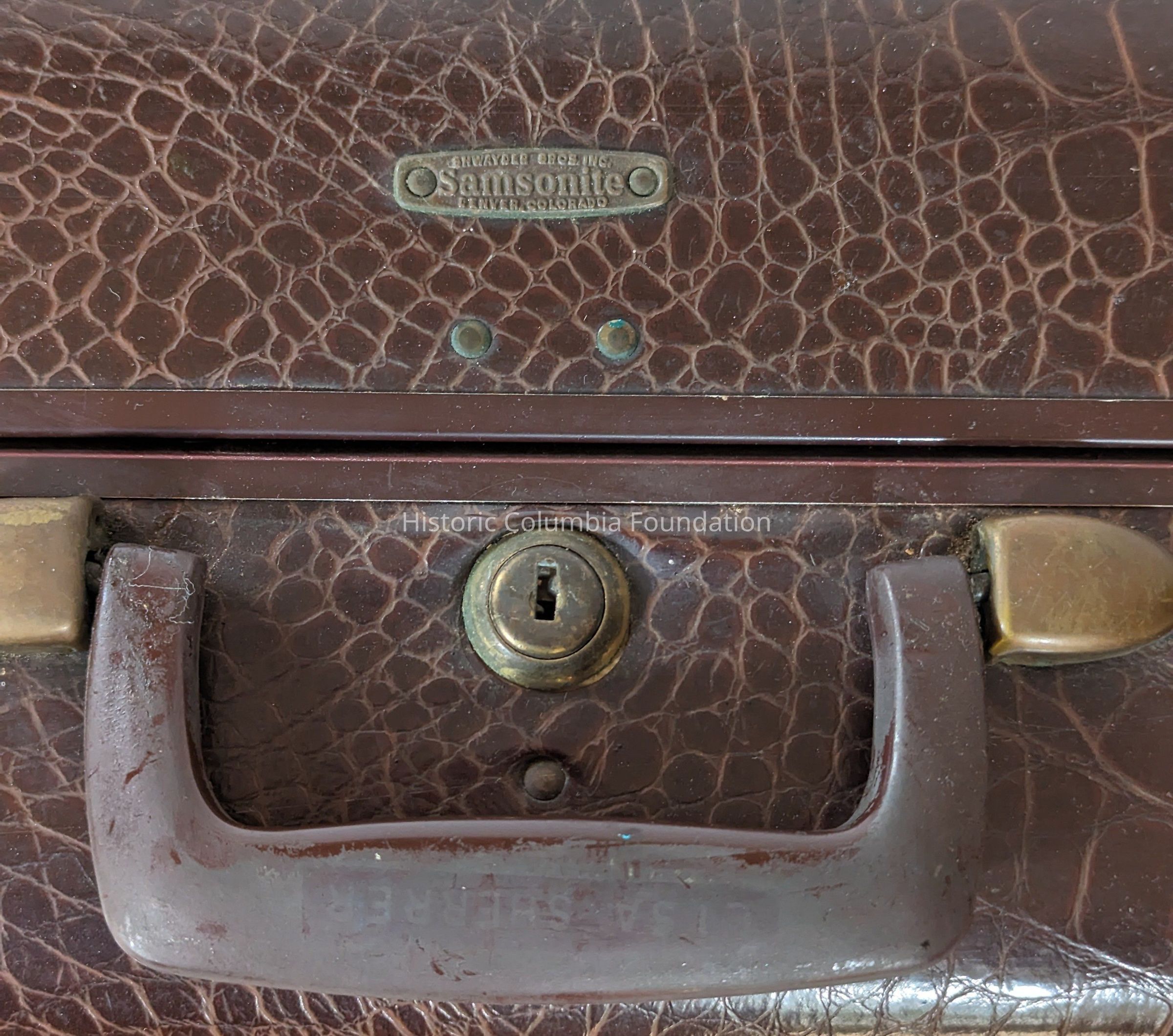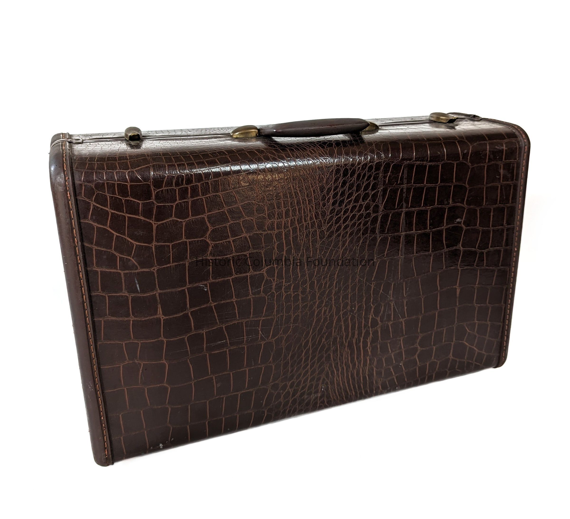 Dark brown suitcase with faux alligator skin finish. The suitcase has metal clasps, a locking mechanism, and a metal plate from the manufacturer reading "SHWADER BROS. INC. / Samsonite / DENVER, COLORADO." Residue from a sticker on the handle reveals the name of the suitcase's previous owner, Lisa Sherrer. The bottom of the suitcase includes a gold and maroon sticker with "STYLE NO. 4121," and the inside includes a cream-colored fabric lining.Made/Created
