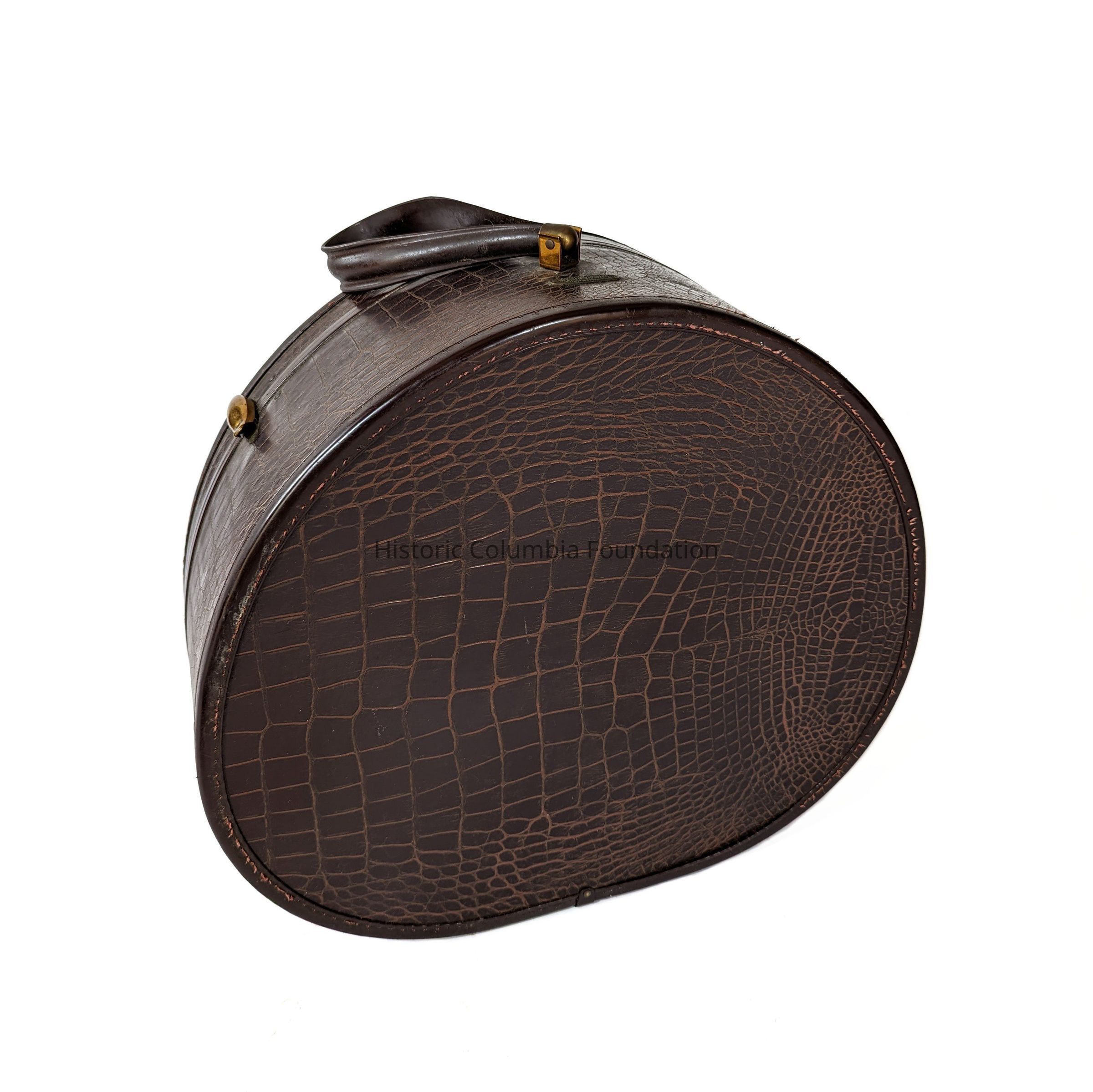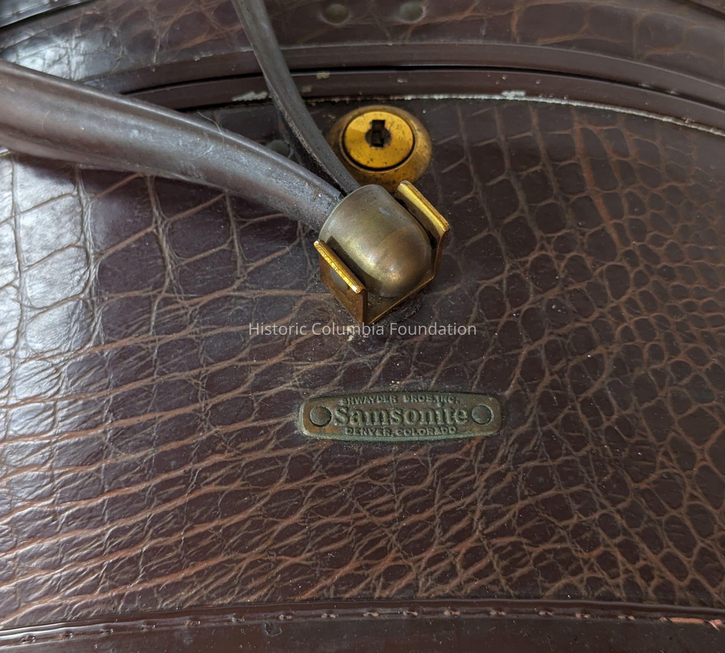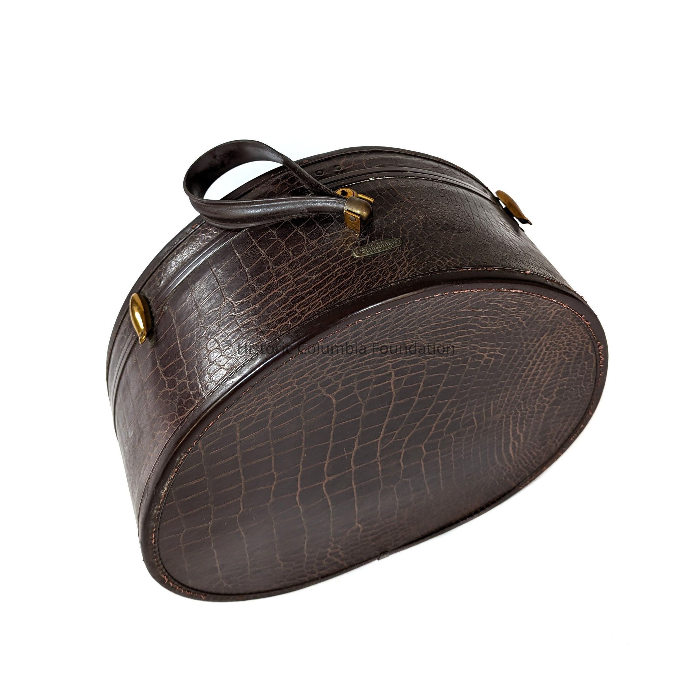 Round dark brown suitcase with faux alligator skin finish. The suitcase has metal clasps, a locking mechanism, a wristlet strap, and a metal plate from the manufacturer reading "SHWADER BROS. INC. / Samsonite / DENVER, COLORADO." The inside includes ecru fabric lining.Made/Created