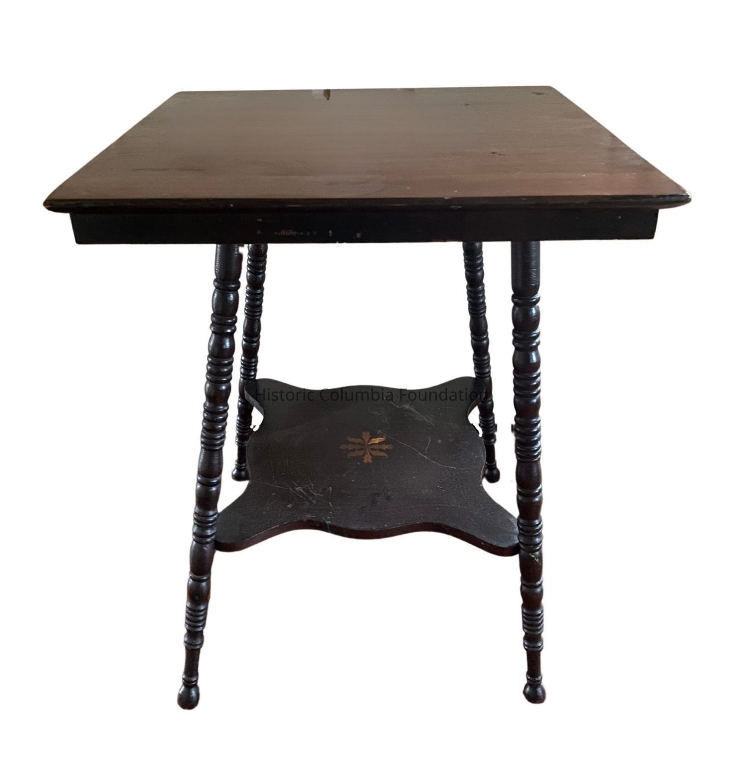 Fern table with four spindle-turned legs. Below the square varnished oak tabletop, the piece features a shelf with curved edges. The shelf is attached to the spindle legs at the corners and features a painted yellow floral motif with eight petals in the center. The table legs are uneven, and the number "2533" is stamped on the underside.Dimensions