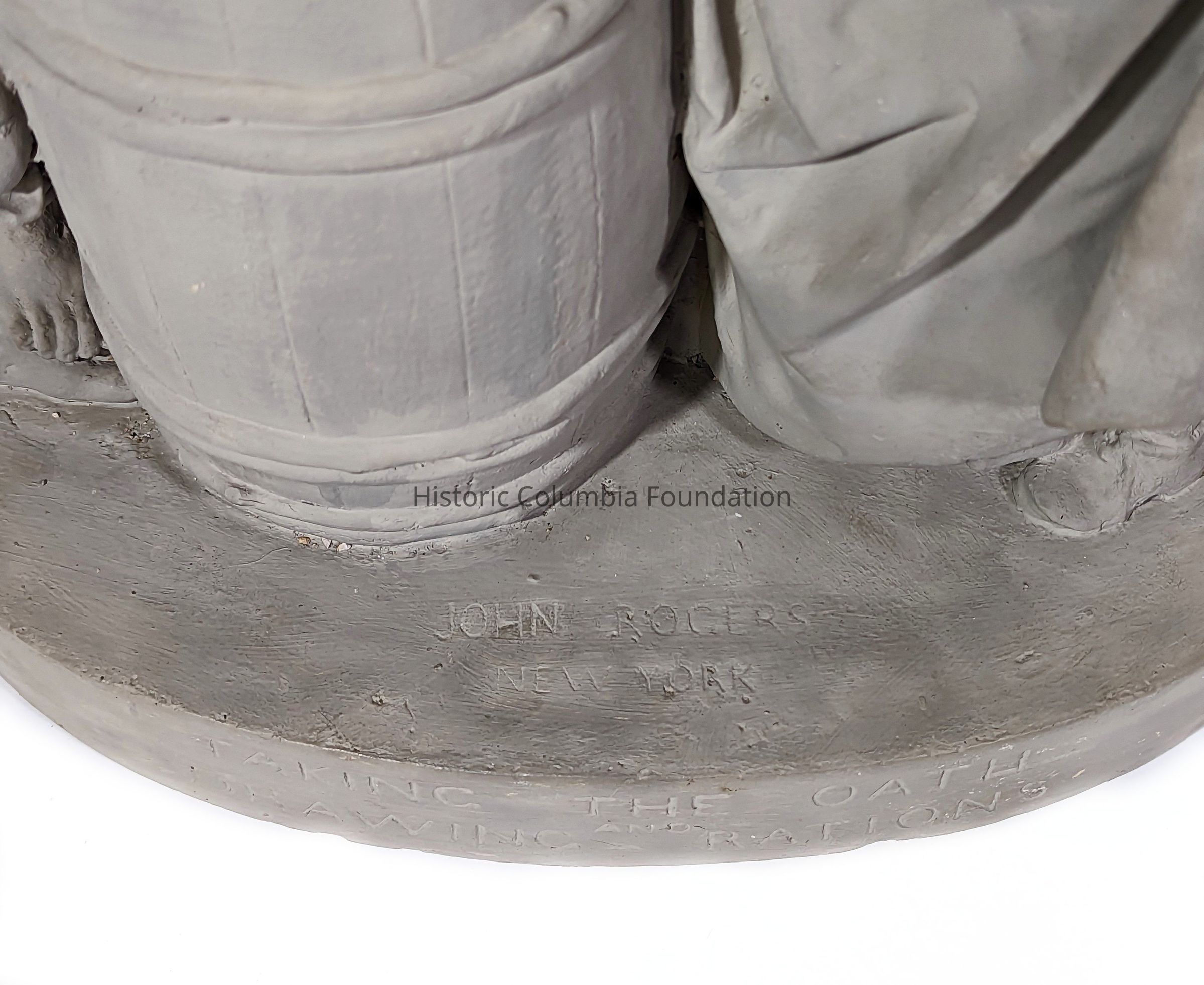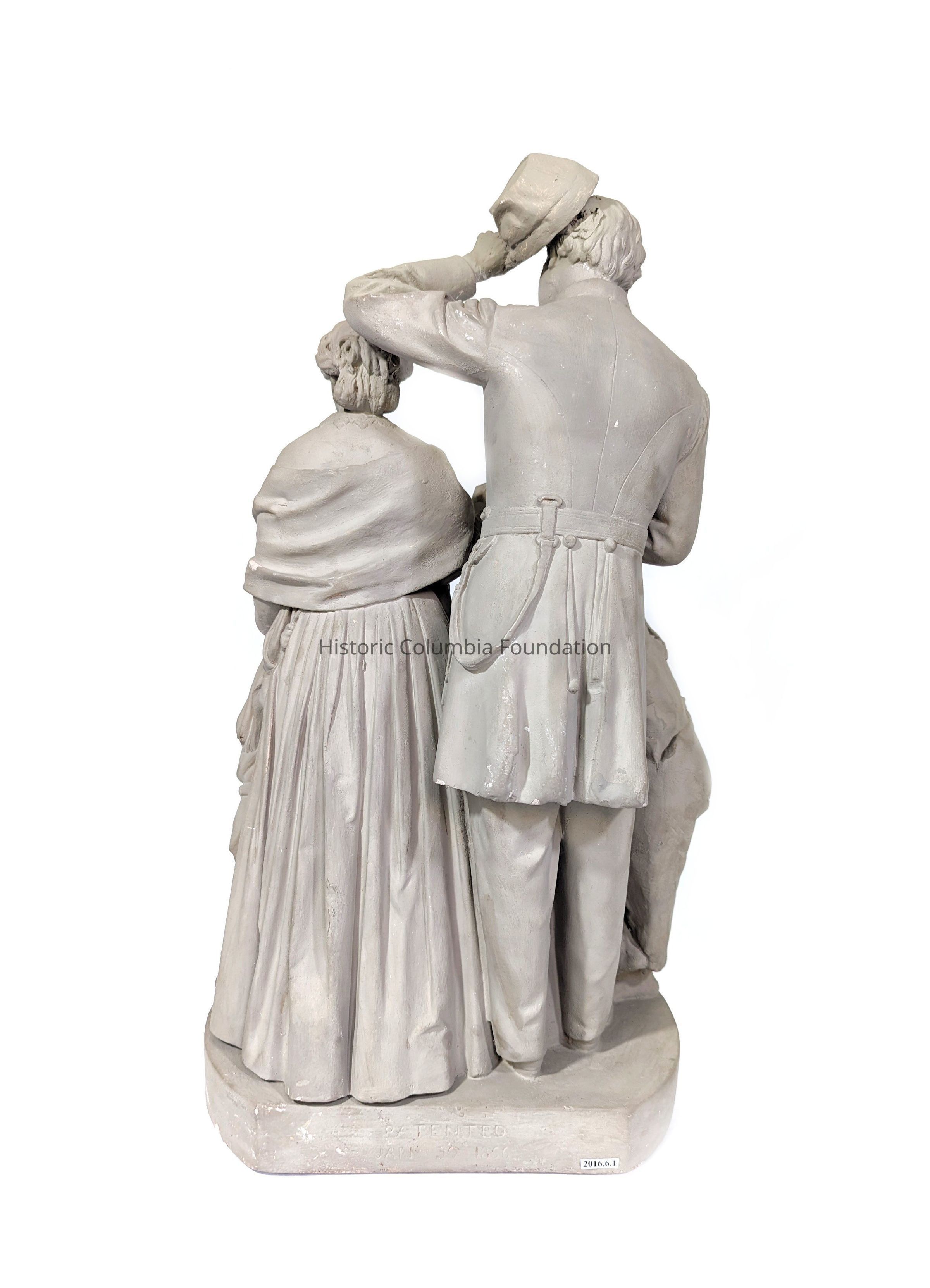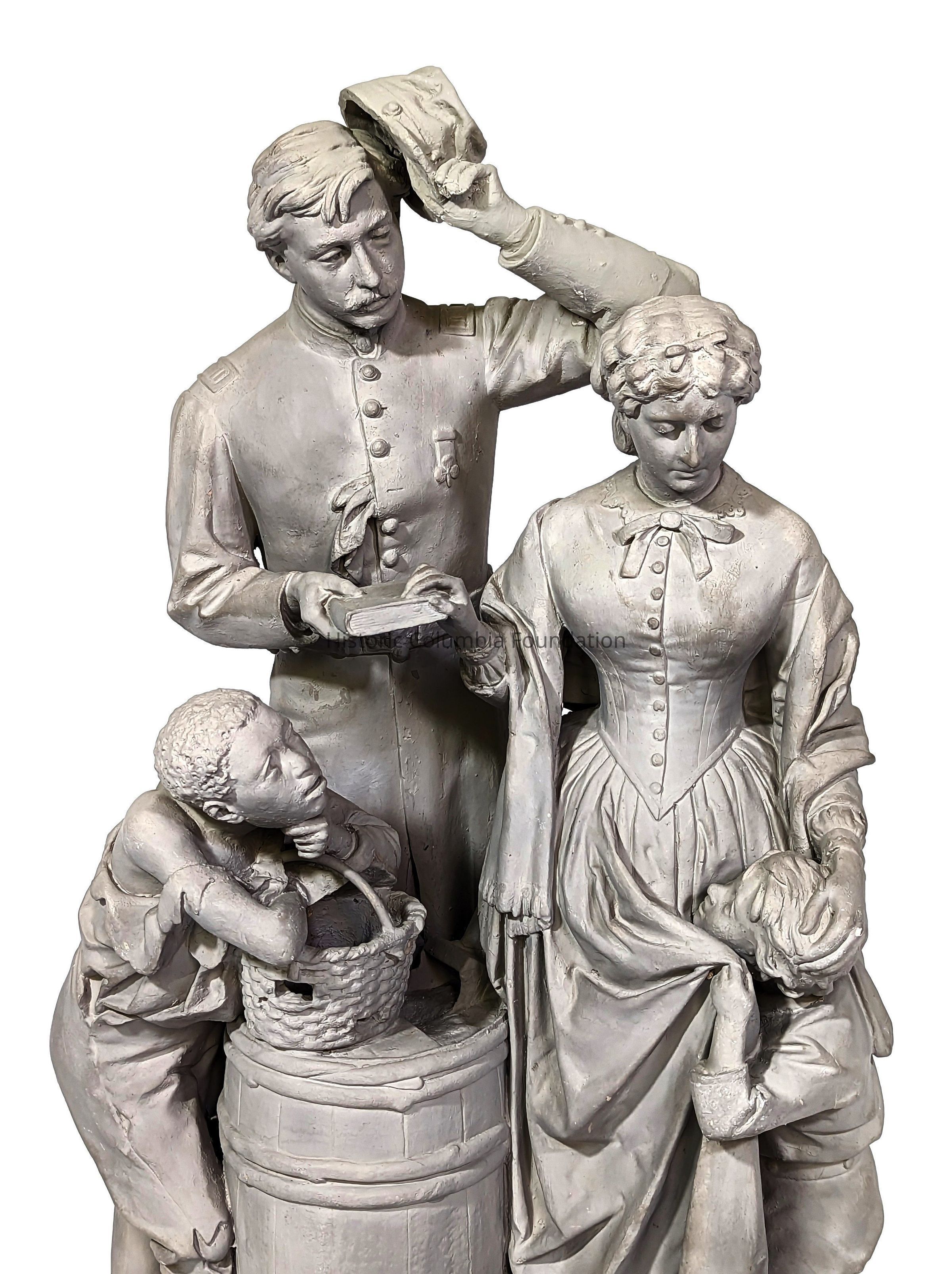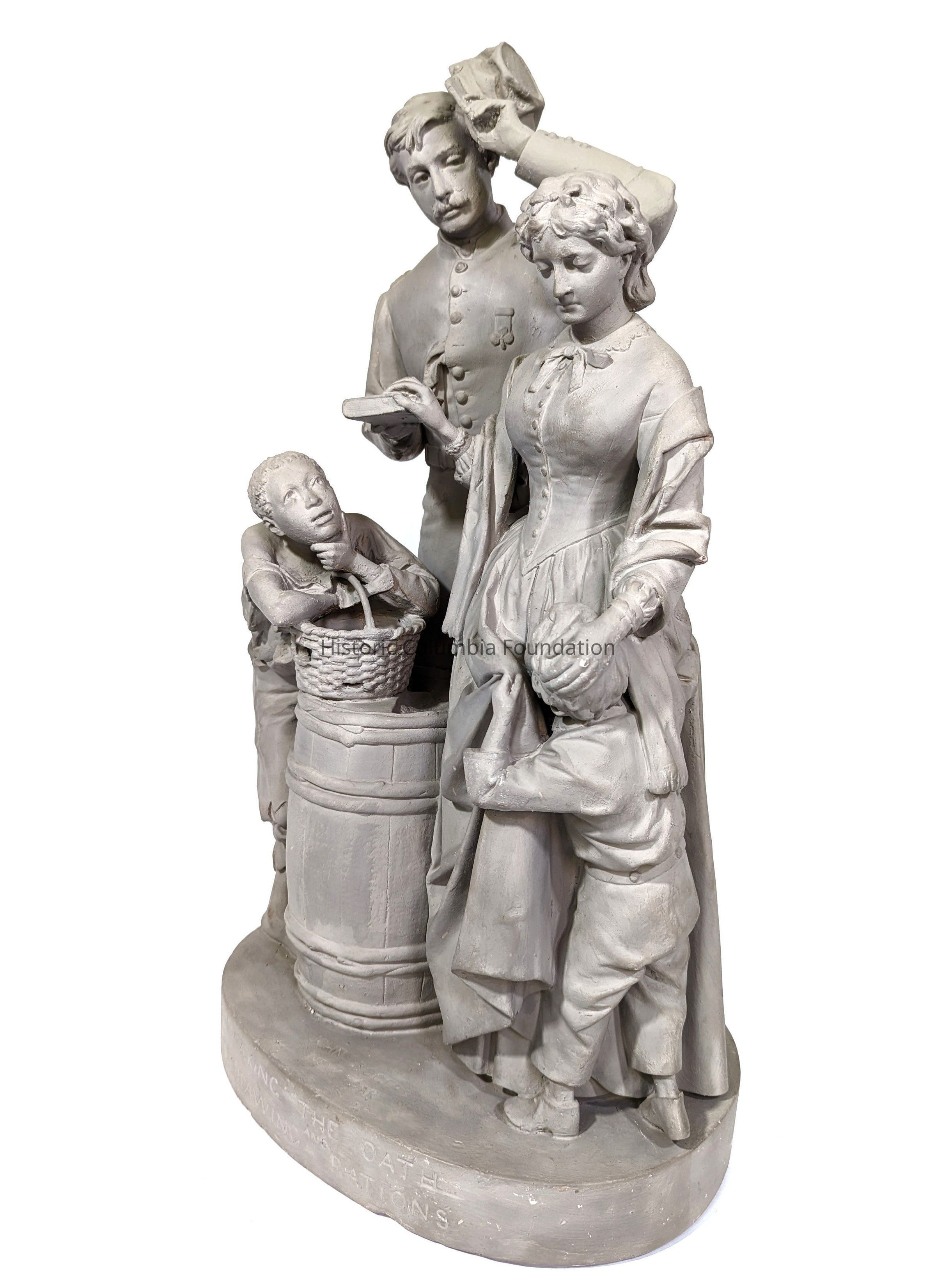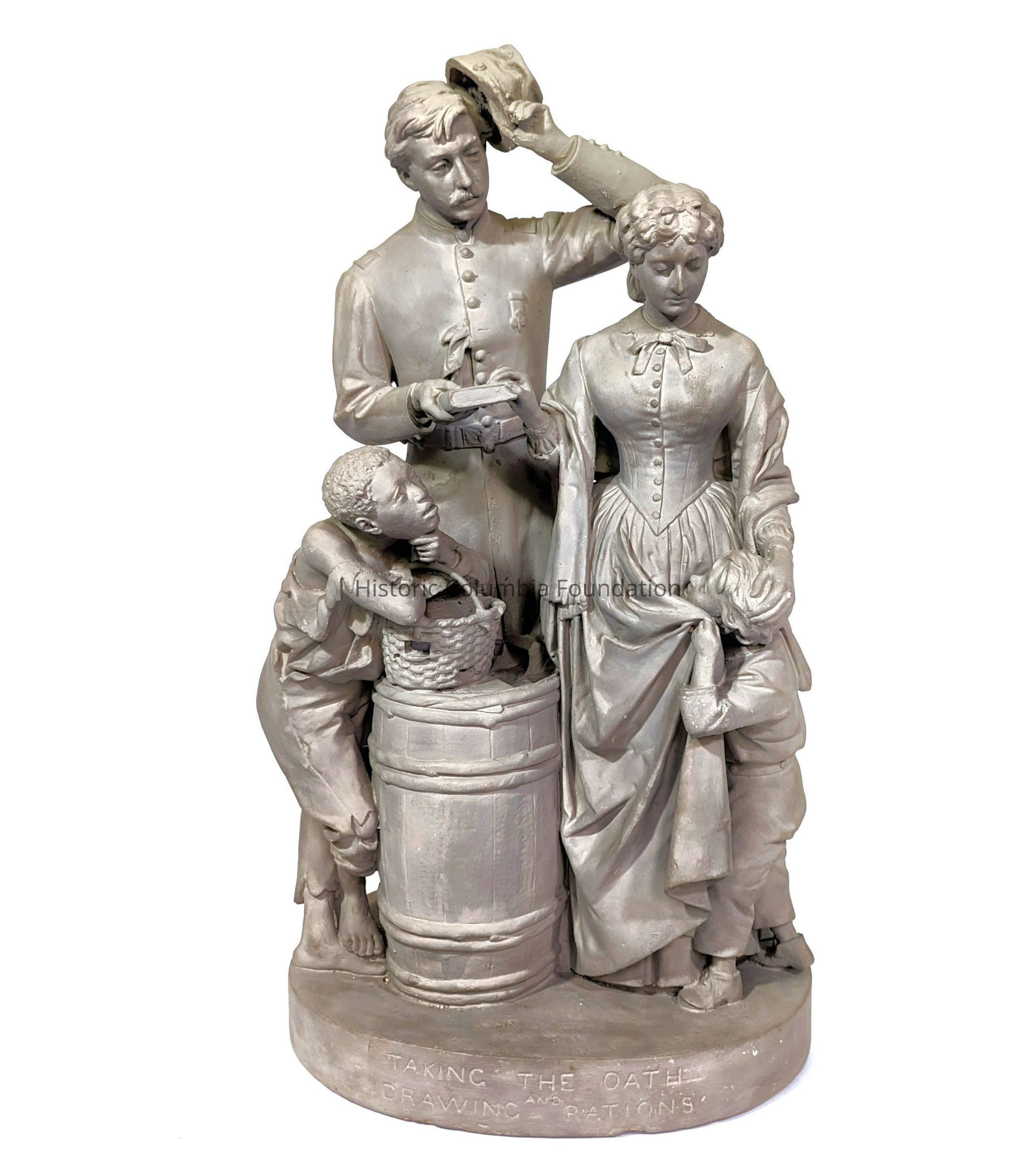 Gray plaster statue of a man, woman, and two children. The man appears in uniform, tipping his hat and holding a book on which rests the woman's hand. She is wearing a long dress, looking down toward her hand that is resting on the head of a small boy clutching her gown. On the other side of the soldier is a presumably enslaved boy in tattered clothing and no shoes. He is leaning on a basket on a barrel, watching the interaction between the man, woman, and other child. The title of the piece is inscribed on the base, "Taking the Oath and Drawing the Rations."Type of Sculpture