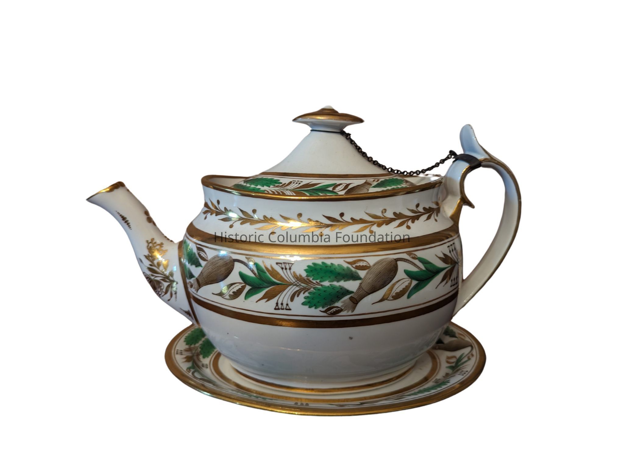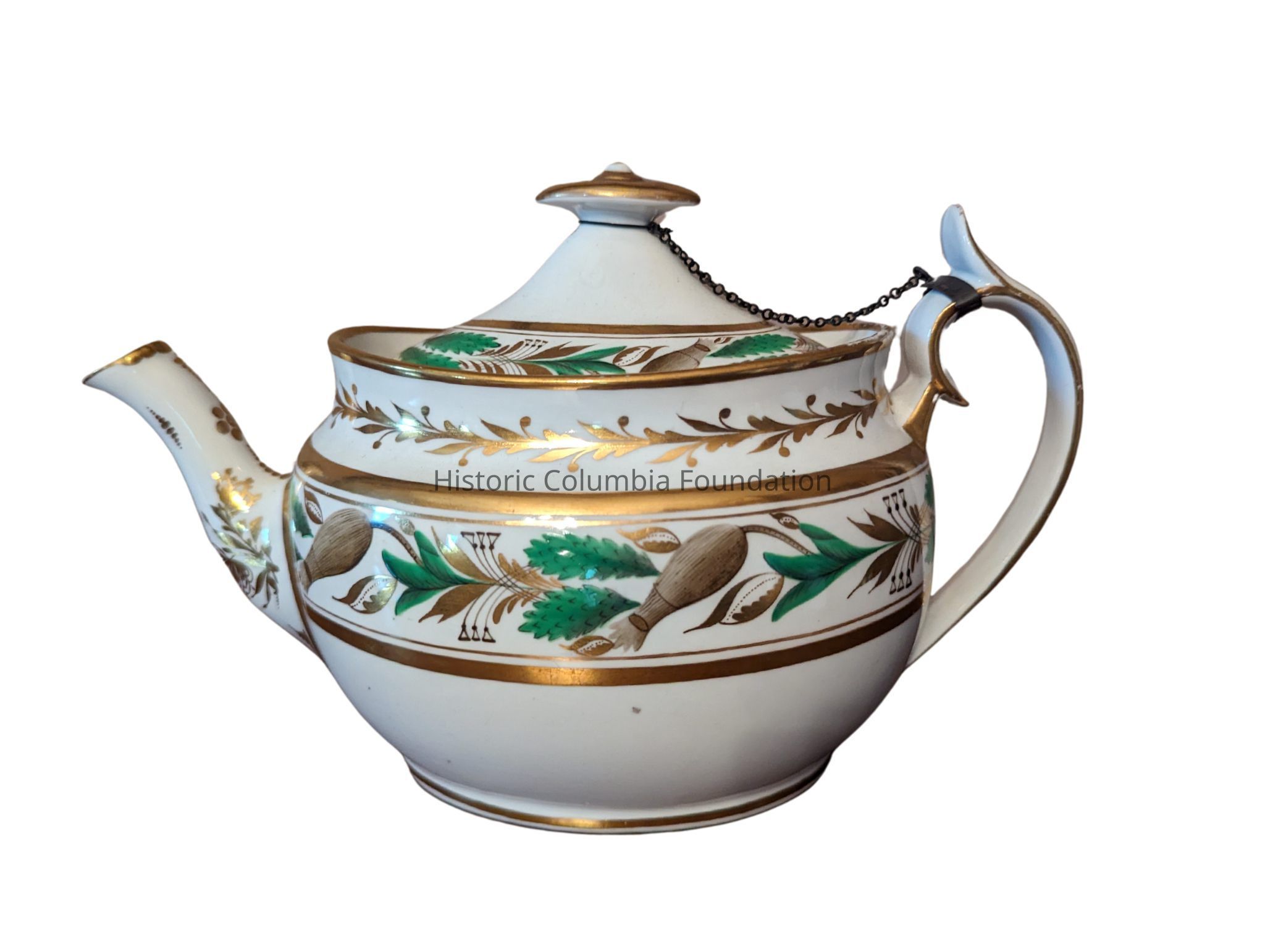 White ceramic teapot with gold banding. It features a green and brown leaf motif design. The top is attached to the handle with a metal chain. Written on the bottom reads "Spode 357 9."Context