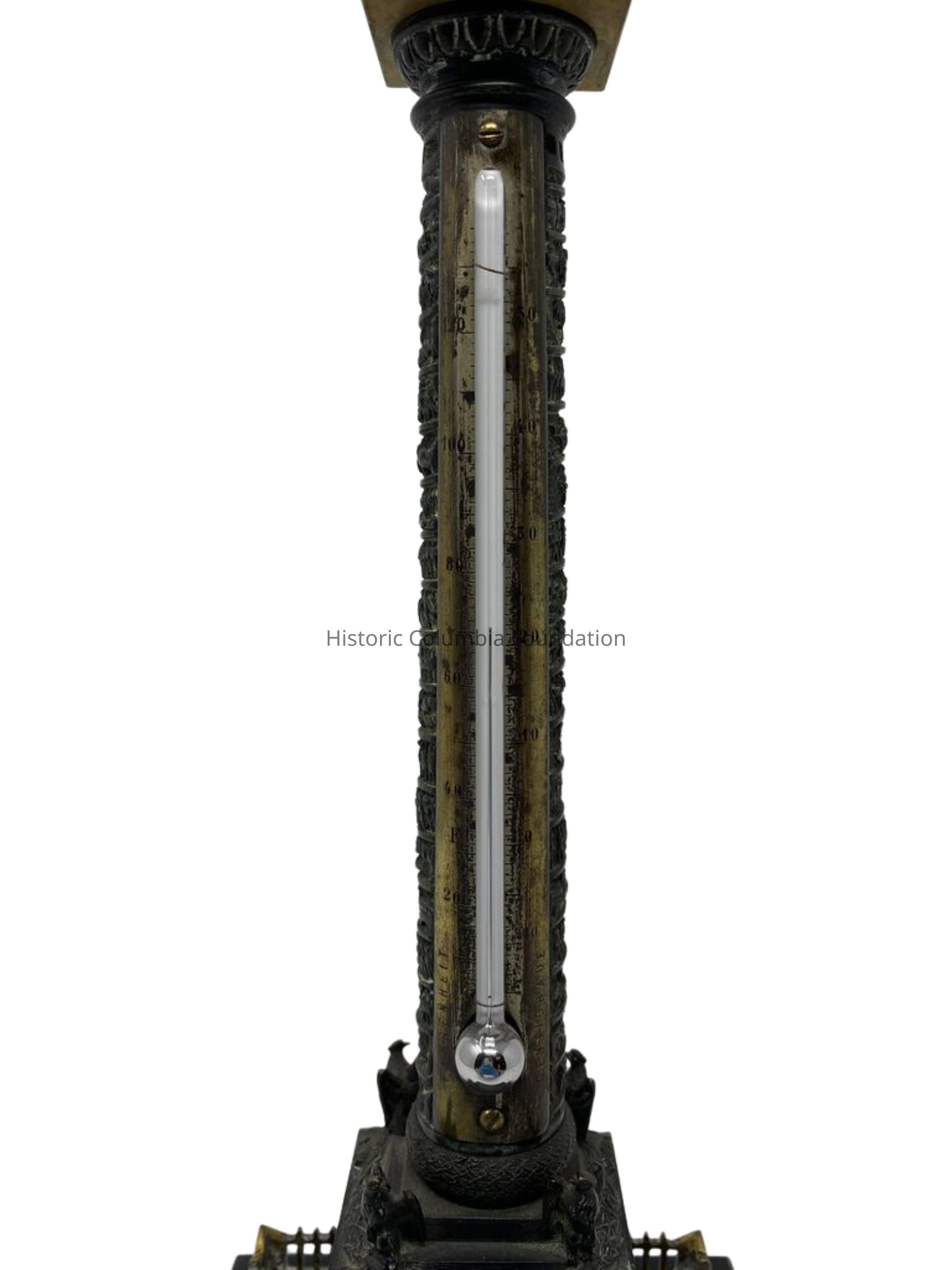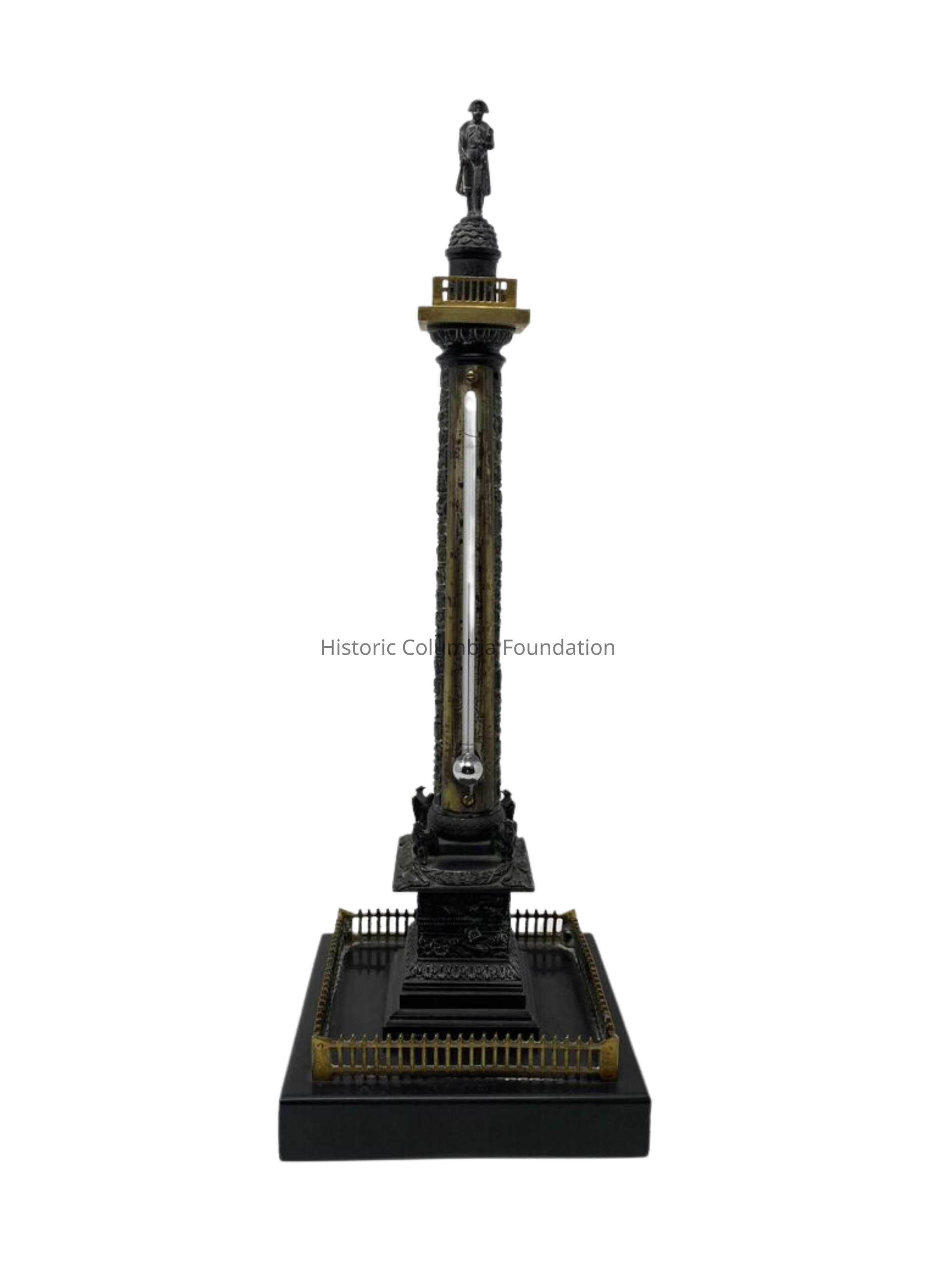 Thermometer set within a miniature architectural model of the Austerlitz Column erected in the Place Vendôme in Paris. It is dark green with patinated bronze and brass on a black marble base. The name "Massin" is etched onto the underside of the brass platform. The top features a man in a long coat and wide hat. Two birds appear at the base.Use