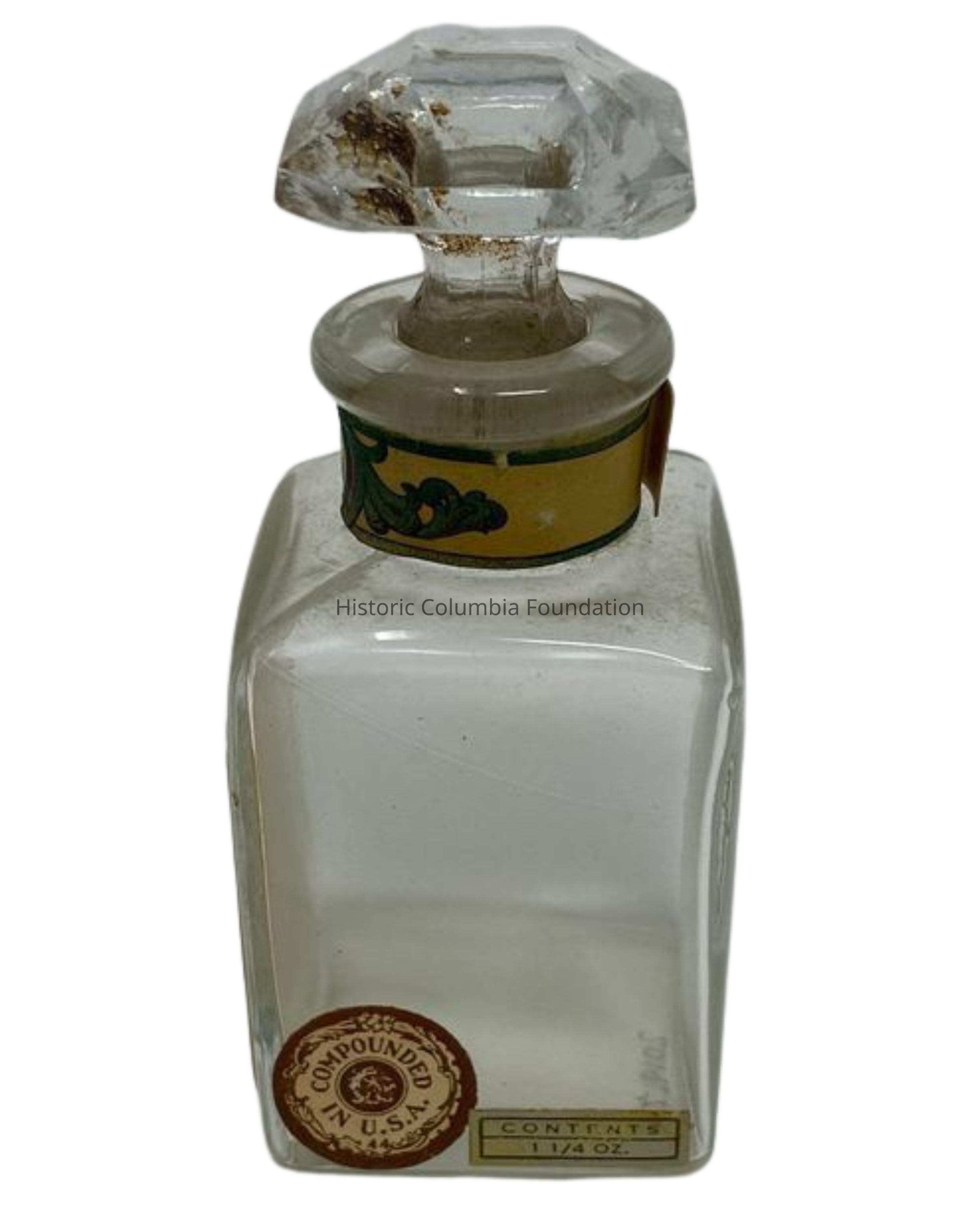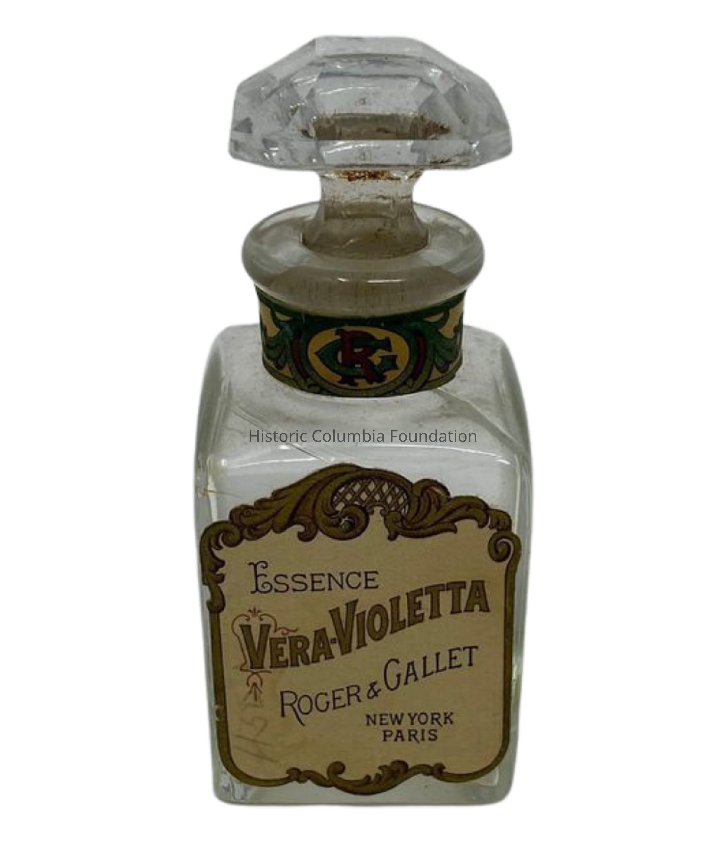 Glass perfume bottle with stopper. On the front, a yellow sticker includes the scent name, "Essence Vera-Violetta," and the manufacturing details, "Roger & Gallet / New York / Paris." One side includes two labels: a round tag that reads “Compounded in U.S.A.” and a rectangular sticker noting the size, “Contents / 1¼ oz.” The rim of the perfume bottle also features the makers' initials, "R" and "G," in an overlapping design.Dimensions