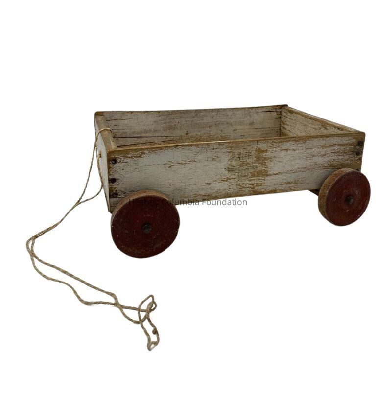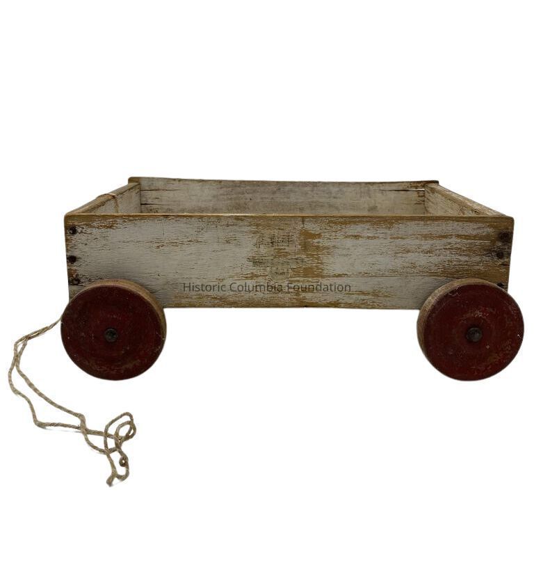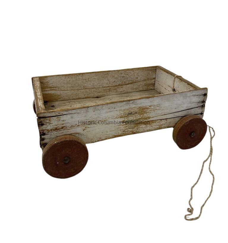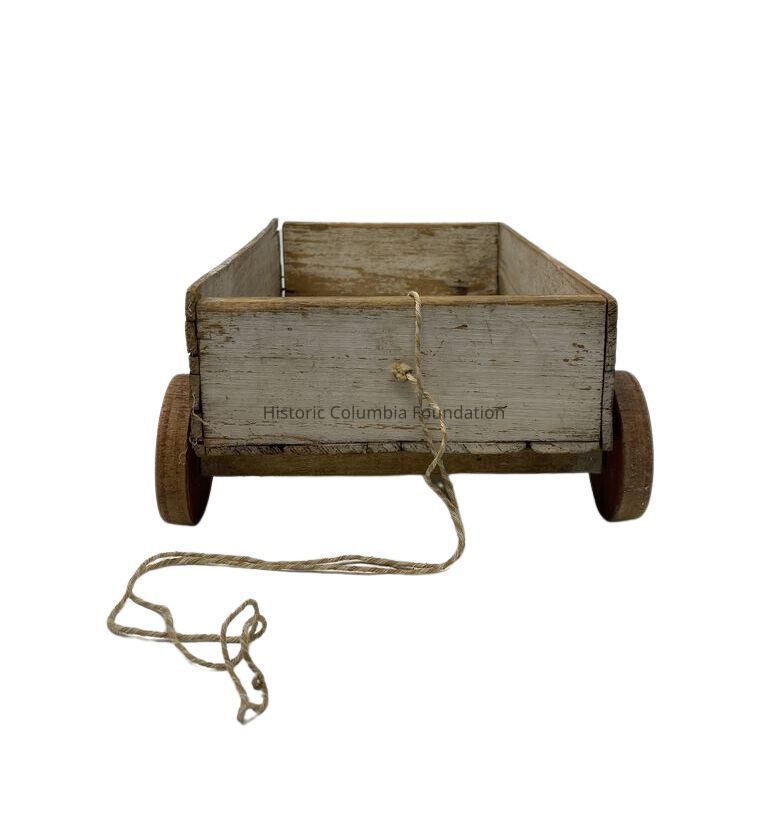 While toy wagons could be used by children for whatever their imagination allowed, wooden pull wagons such as this were commonly sold containing another toy: wooden blocks. The earliest mention of the use of toy blocks of various shapes was in the early 1800s, yet alphabet blocks predate this style of toy. Alphabet blocks originally gained popularity after philosopher John Locke (1632-1704) noted the value of combining learning with play. Wooden wagons could hold these blocks and also allow for children to gain hand-eye coordination while maneuvering the wagon behind them.