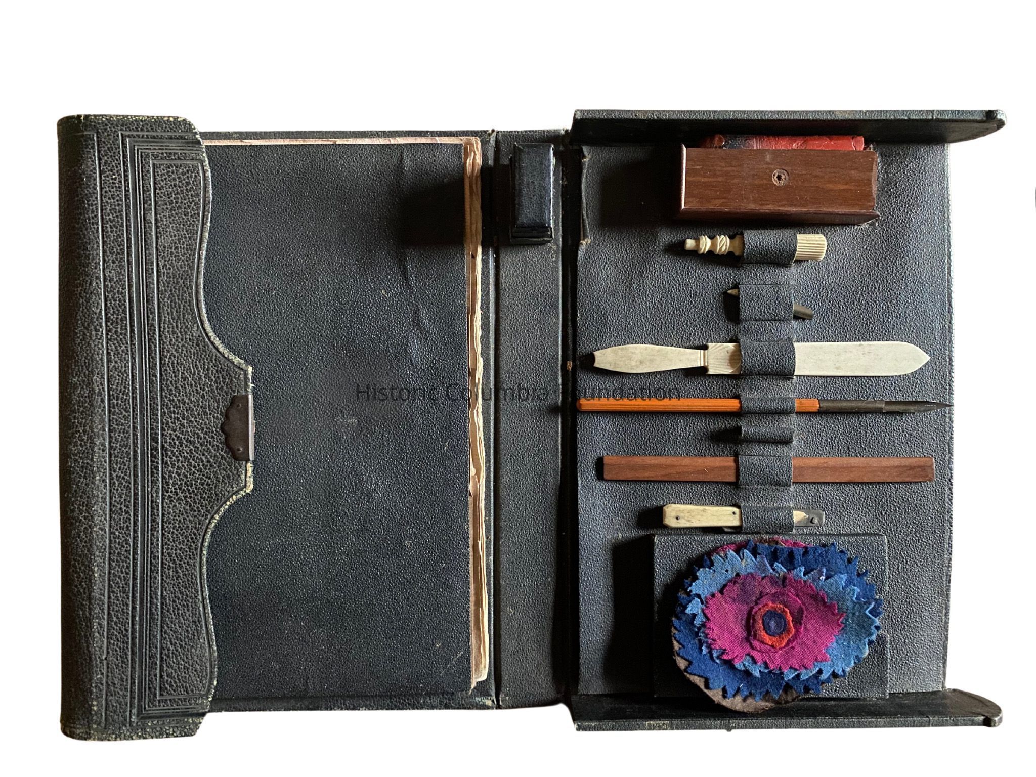 Black case with various writing implements. The case has an almost scalloped lip that ensure the case stays closed when not in use. There are slots for papers as well as for the associated tools, including sealing wax, a lighter, a seal, a letter opener, a ruler, a pen, and a small knife.Use